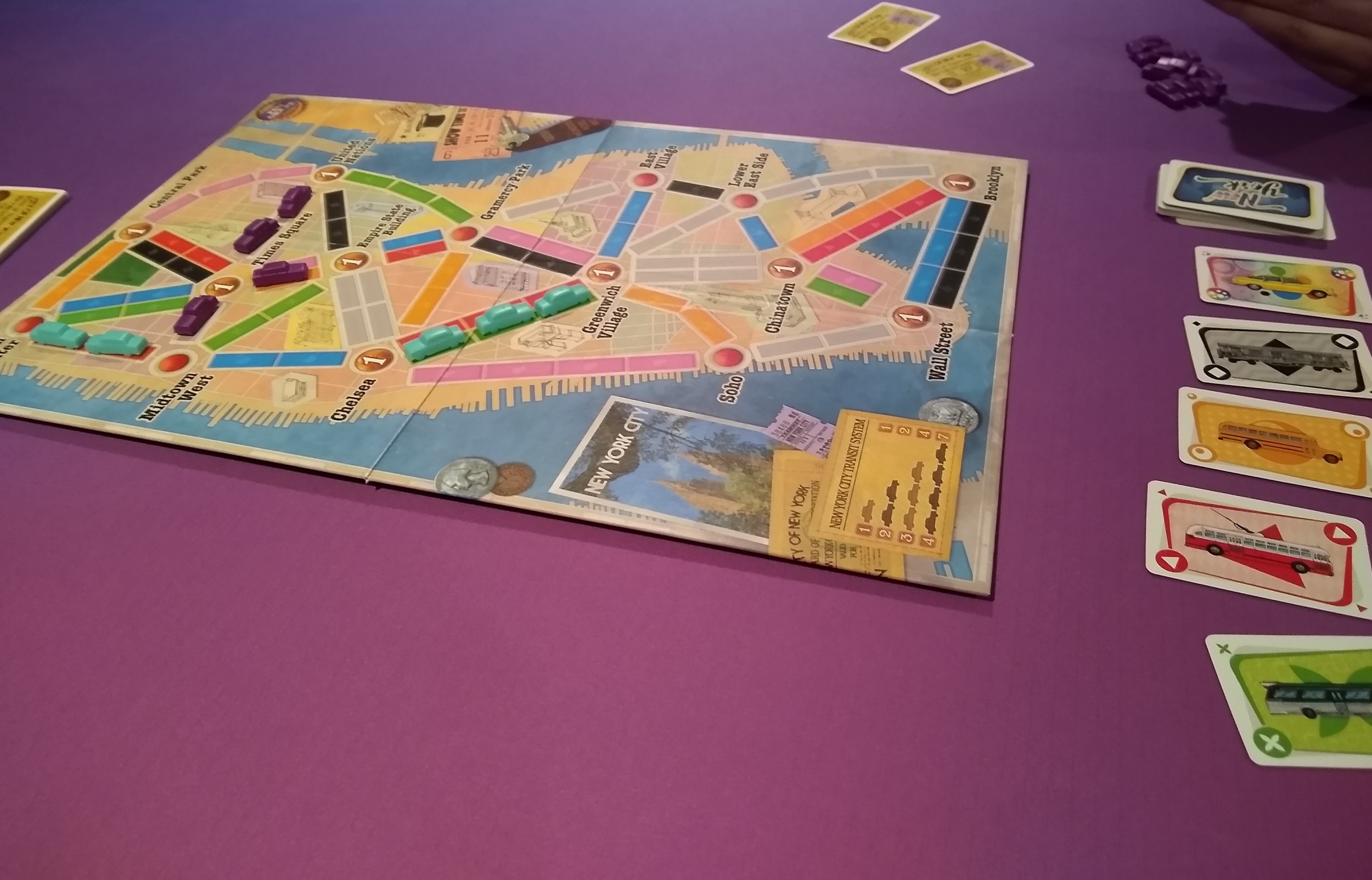 WHAT: A small route building game where players collect sets of colored cards in order to lay taxis along routes to get from Point A to Point B on their secret ticket cards (which show the routes they need to complete).