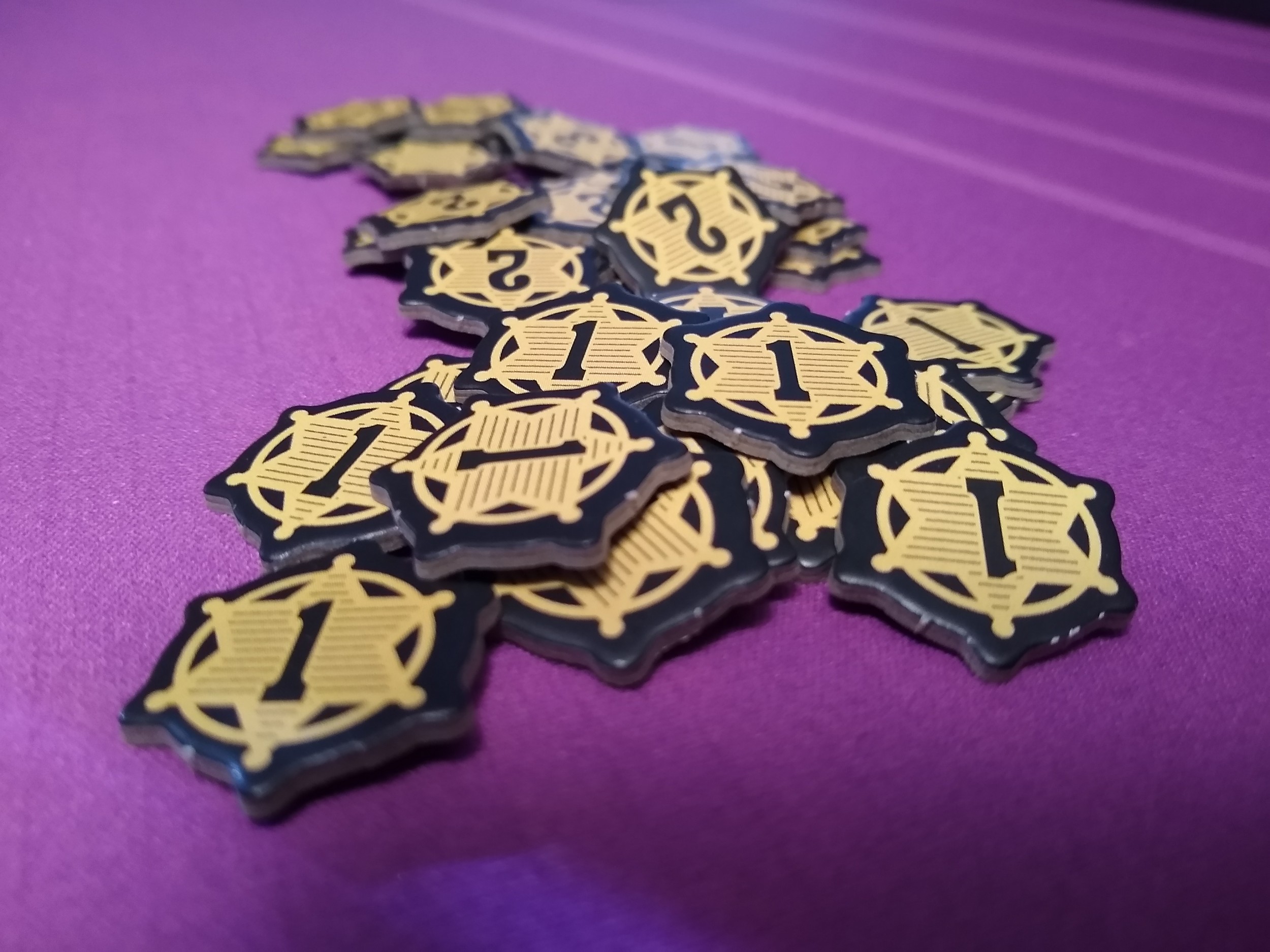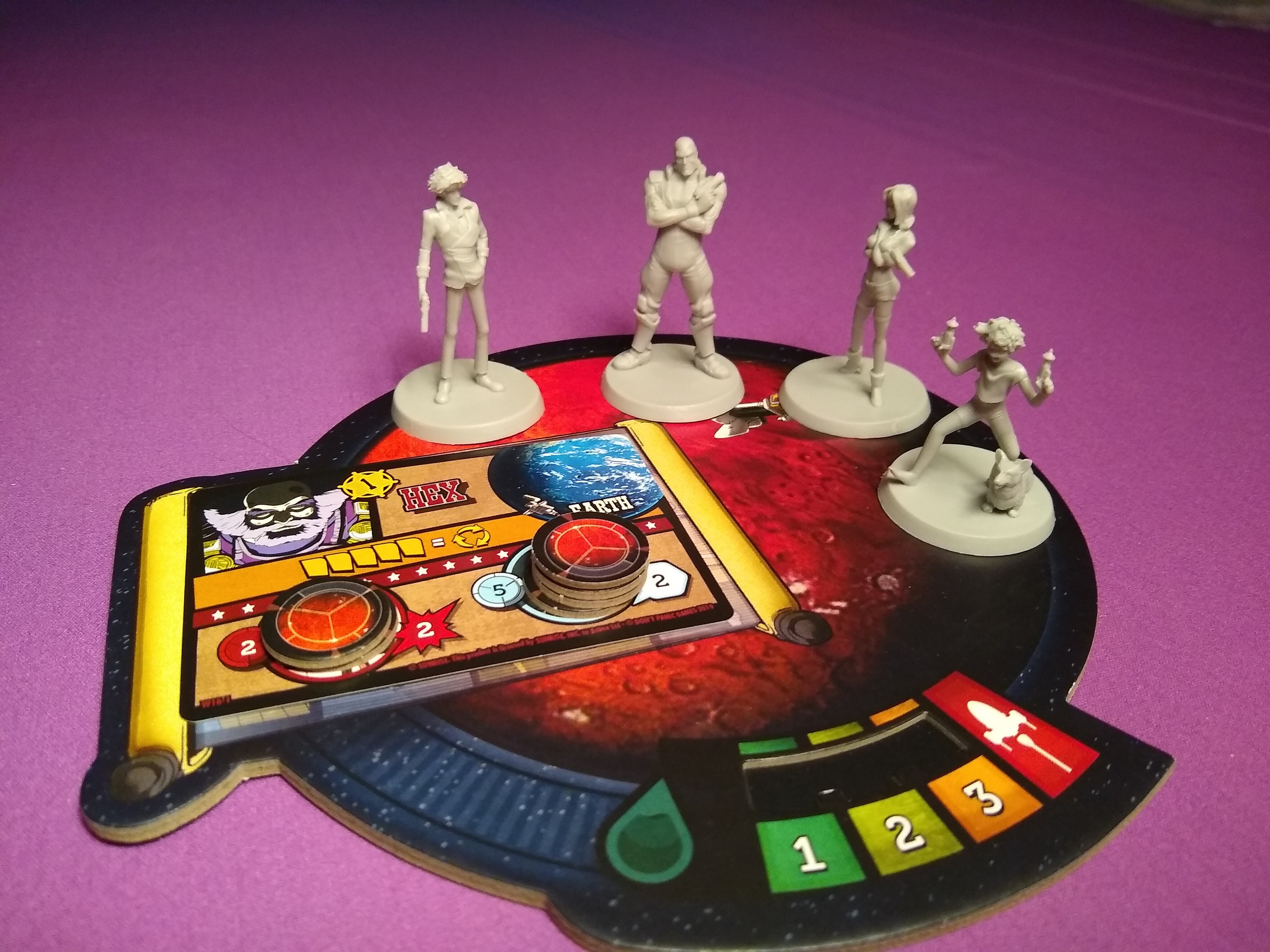 All of the boards and cardboard tokens are really sturdy, high quality, which is great. The player boards have handy quick references on them for character actions, much appreciated, and all the planets and player boards have slots for fuel cubes, which they fit in well. Never really saw an issue with them falling out. I also really liked the Big Shot stand, which was just a fun way to have criminal cards come out.