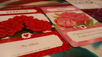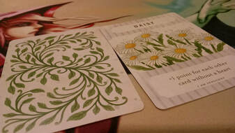 As I mentioned, this is a drafting game all about flowers. Players use the “I split, you choose” mechanic to offer flowers to their opponents and then collect the leftovers into their own bouquets. (You get first choice on an opponents’ turn, and those proclaimed “leftovers” on your own turn). There’s also just a hint of bluffing involved since 1 card always goes face-down; you want to offer just the right card up to an opponent that doesn’t give them too many points, but leaves you with an excellent addition to your own flower collection.
