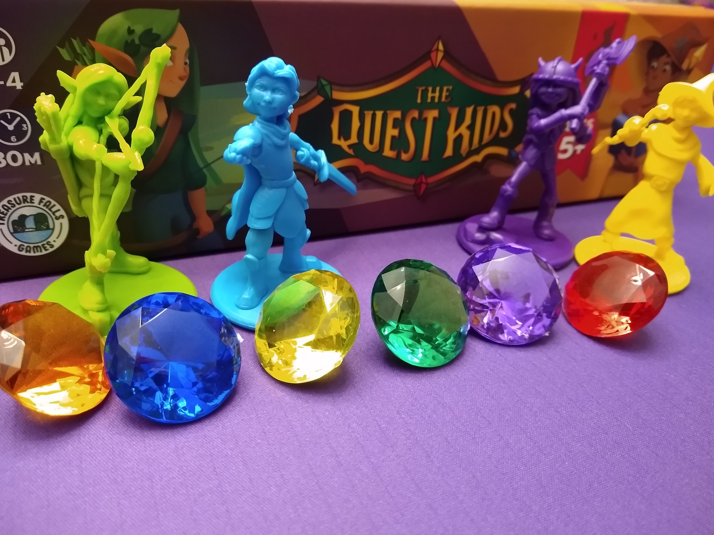 Gems are big, chunky, translucent – absolutely love them. The treasure bag is nice quality with a soft, velvety feel. The treasure tokens are thick cardboard tokens. They are color-coded for characters, and have character faces on them, but I thought character initials might have been more useful, since the images were so small, and I thought the negative point tokens were quite hard to read overall – easy to miss the negative symbol.