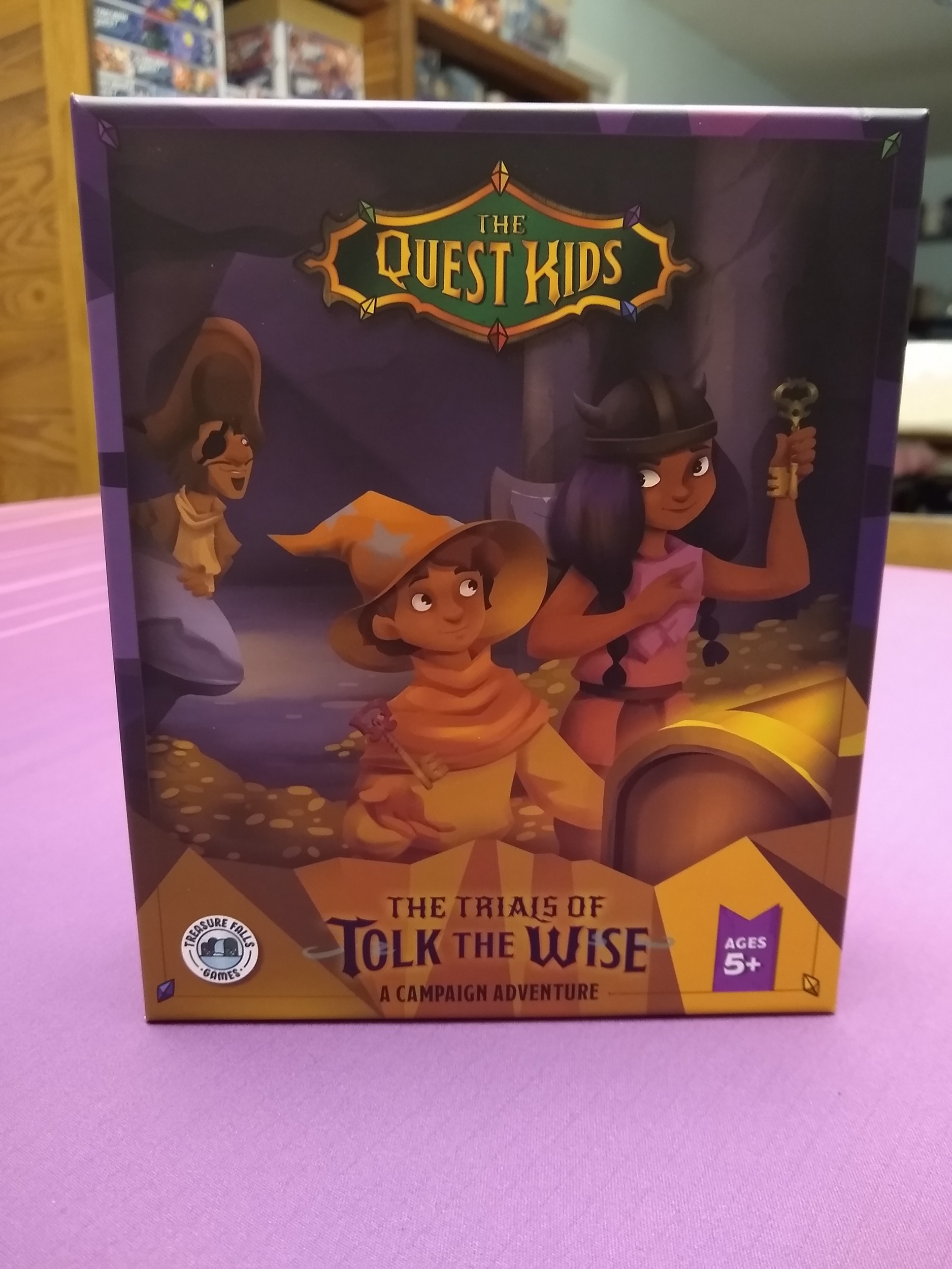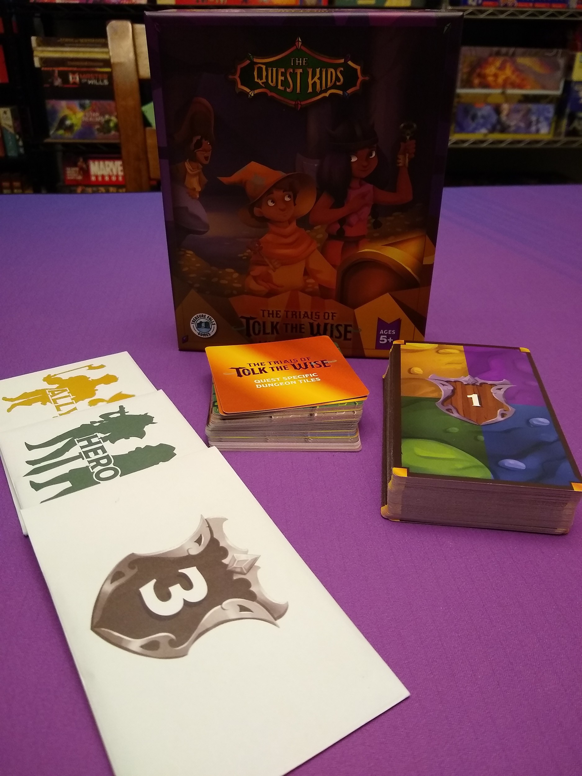 A light dungeon crawler for 2-4 adventurers great for kids and / or casual gamers of all ages! Players each take on the role of a quest kid exploring Tolk’s cave for treasures, gems, monsters, and more. Players must collect ability cards to have a chance at scaring bad guys away and collecting special items, but can also often help each other out. They can complete quests along the way, and earn Kind Kid cards when helping others out, which can grant them more points and special bonuses (health, treasures, extra turns, et cetera). Once the cave has been completely explored, players score their findings and successful scares, and the quest kid with the most stars wins!