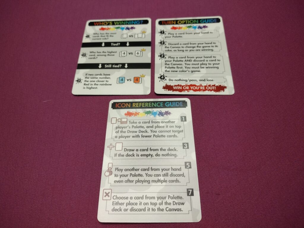 Advanced – Adds 2 rules: 1) Draw a card if you discard to the canvas and the number on the discarded card is higher than the number of cards in your palette. 2) The winner of the round scores all the cards in their palette that match the current game rule and play to 20/35/30 for 2/3/4 players. I definitely like this because of the opportunity to get more cards and keep your options open, and the scoring is much more fulfilling than just doing one round and being done.