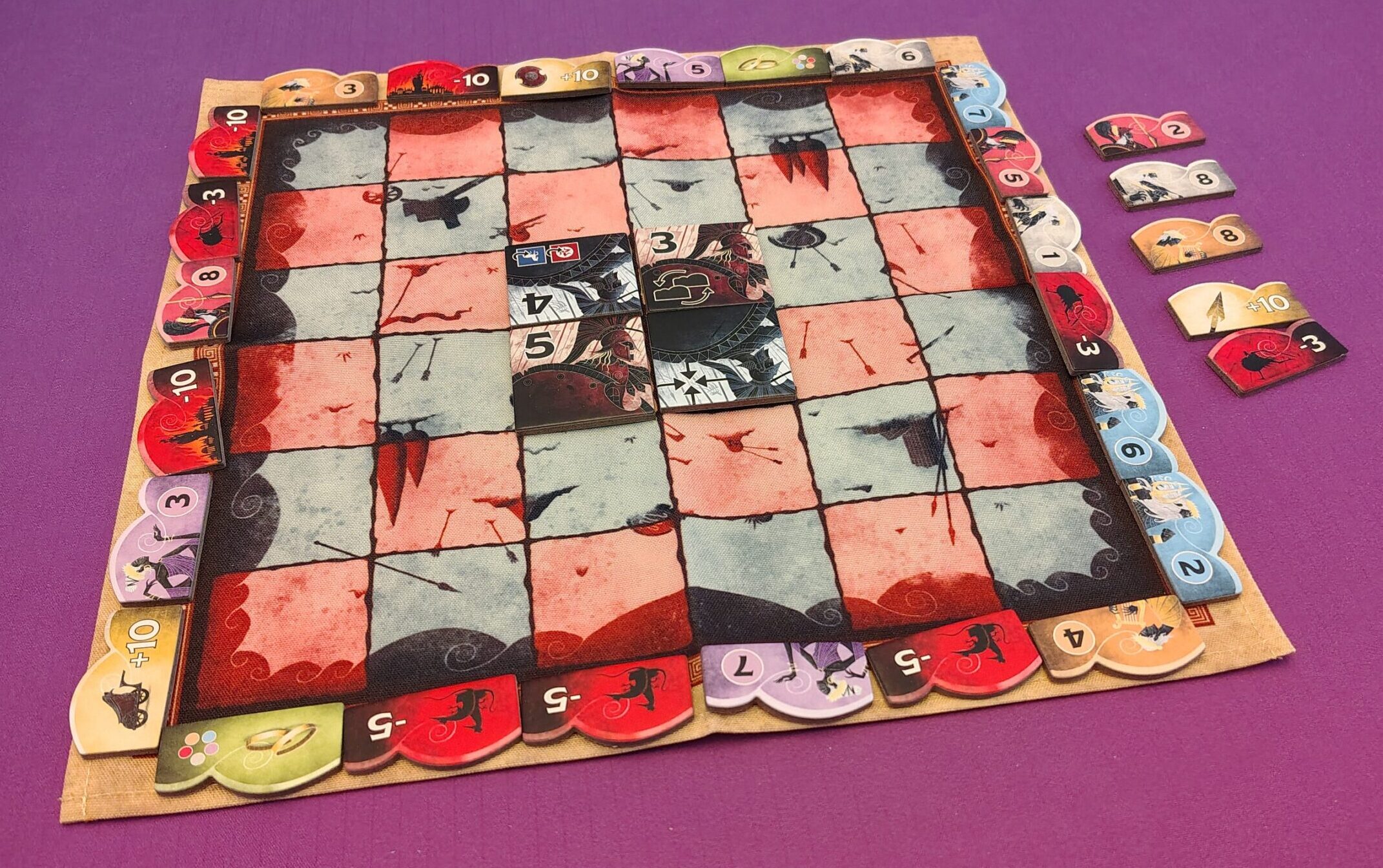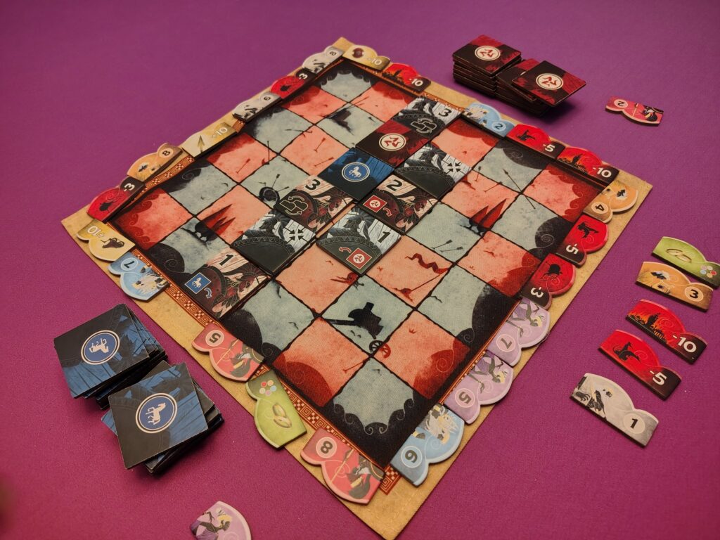 ⚙️Tile Laying – On a turn, players will play a tile to the grid for their side. Most tiles have special abilities when played, and players can optionally use them as well