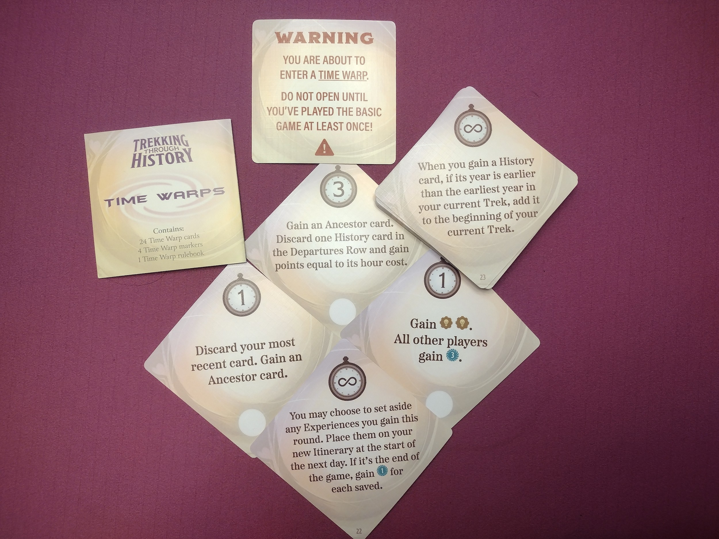 Time Warps – This mini expansion has 24 cards, 3 used per game. Each card has either an ongoing effect, or an effect that players must activate by spending time on their turn, instead of picking a history card as usual.