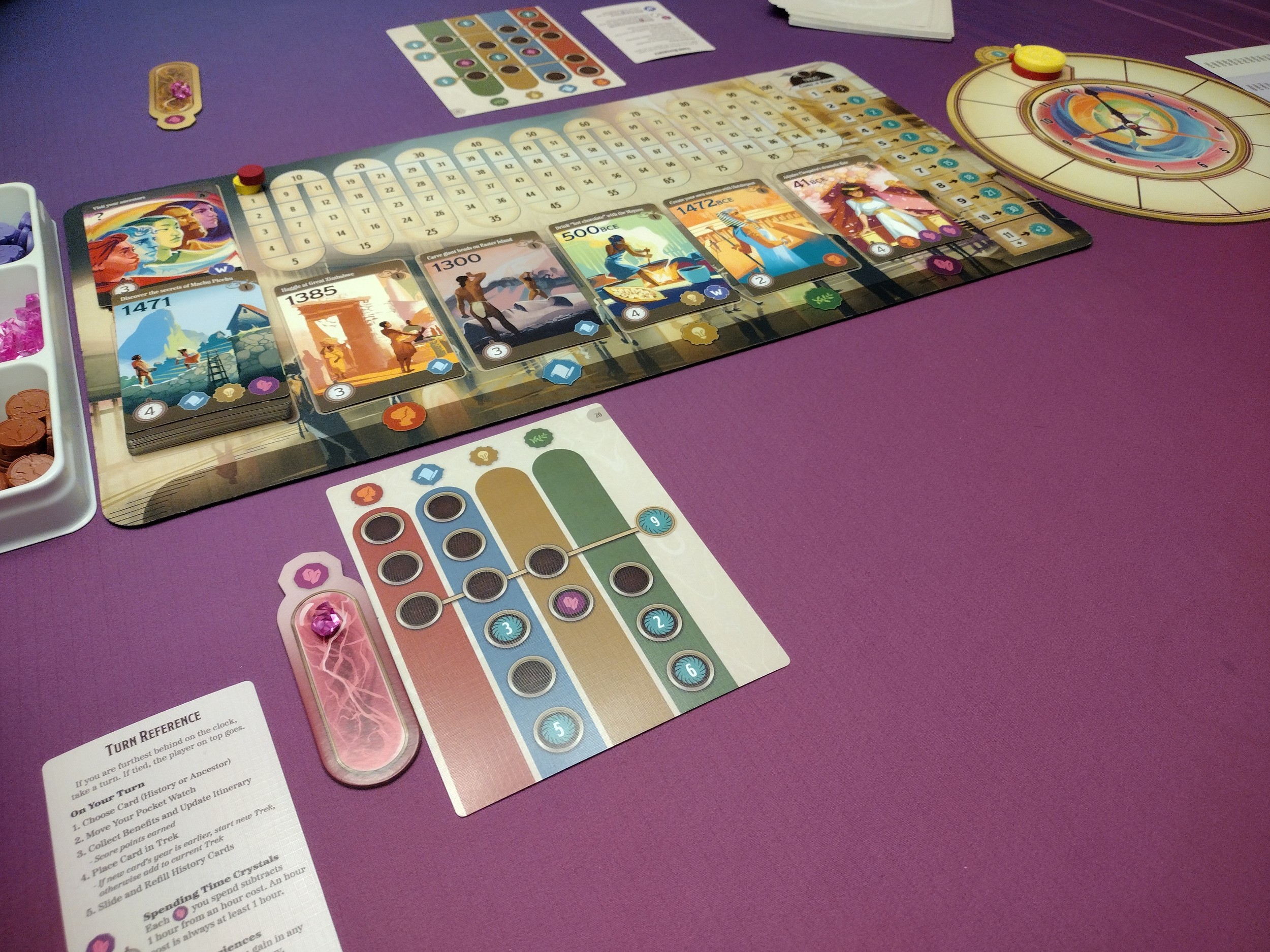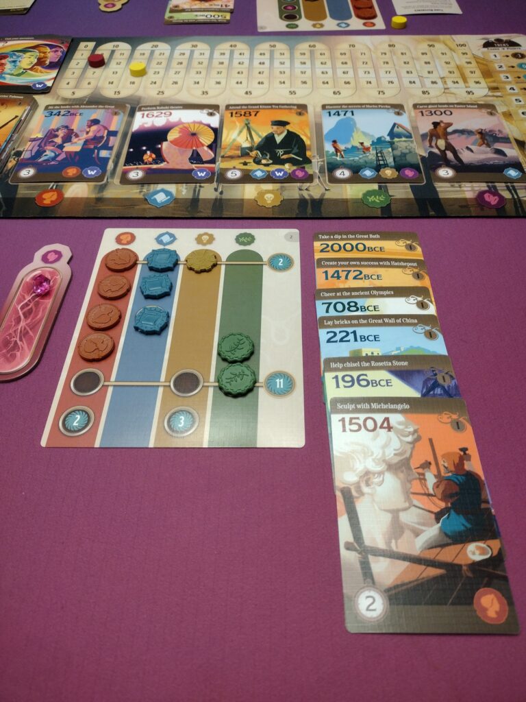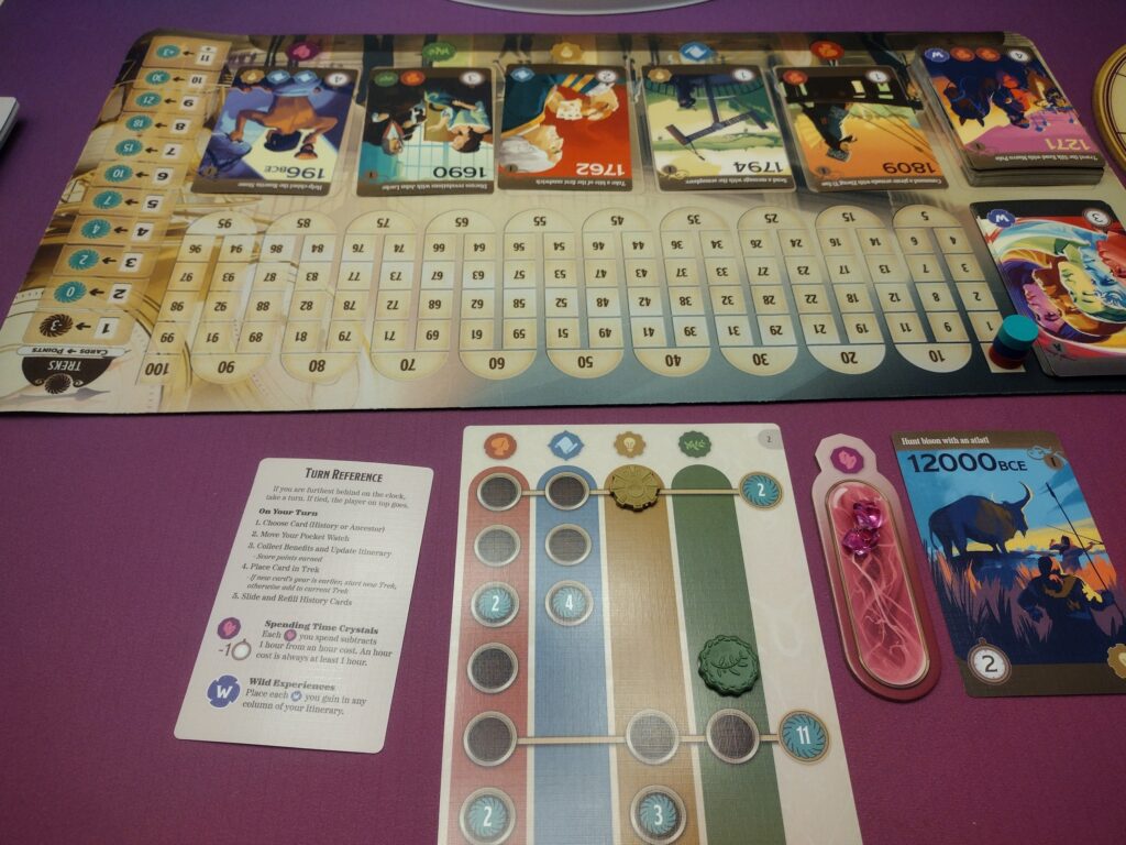 Drafting cards will also get players various experience tokens, which they will use to fill in their itinerary card to earn points and time crystals.