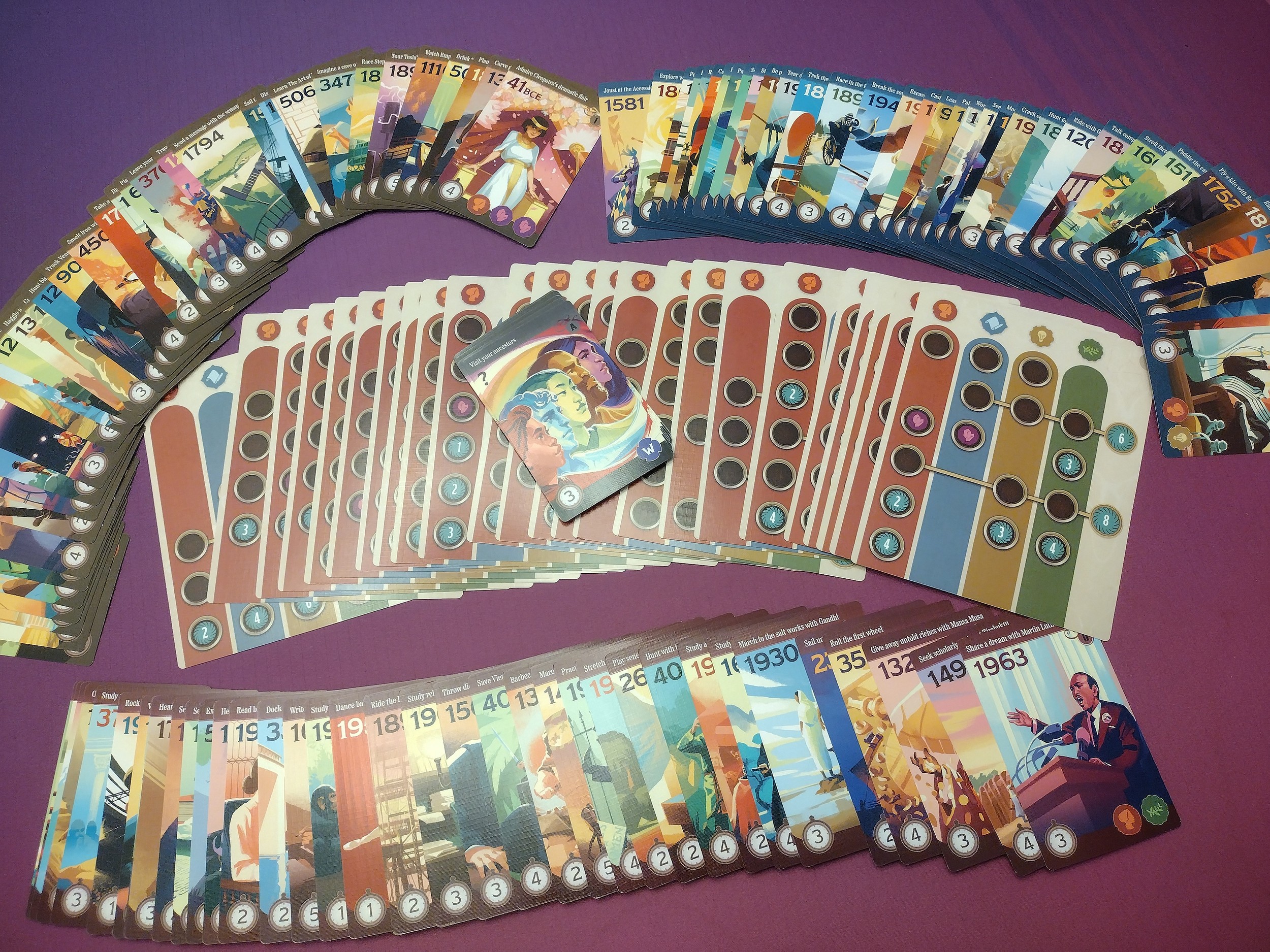 - Cards all feature little excerpts about the event on the back so players can read/learn about it if they want, but it doesn’t distract from the game design
