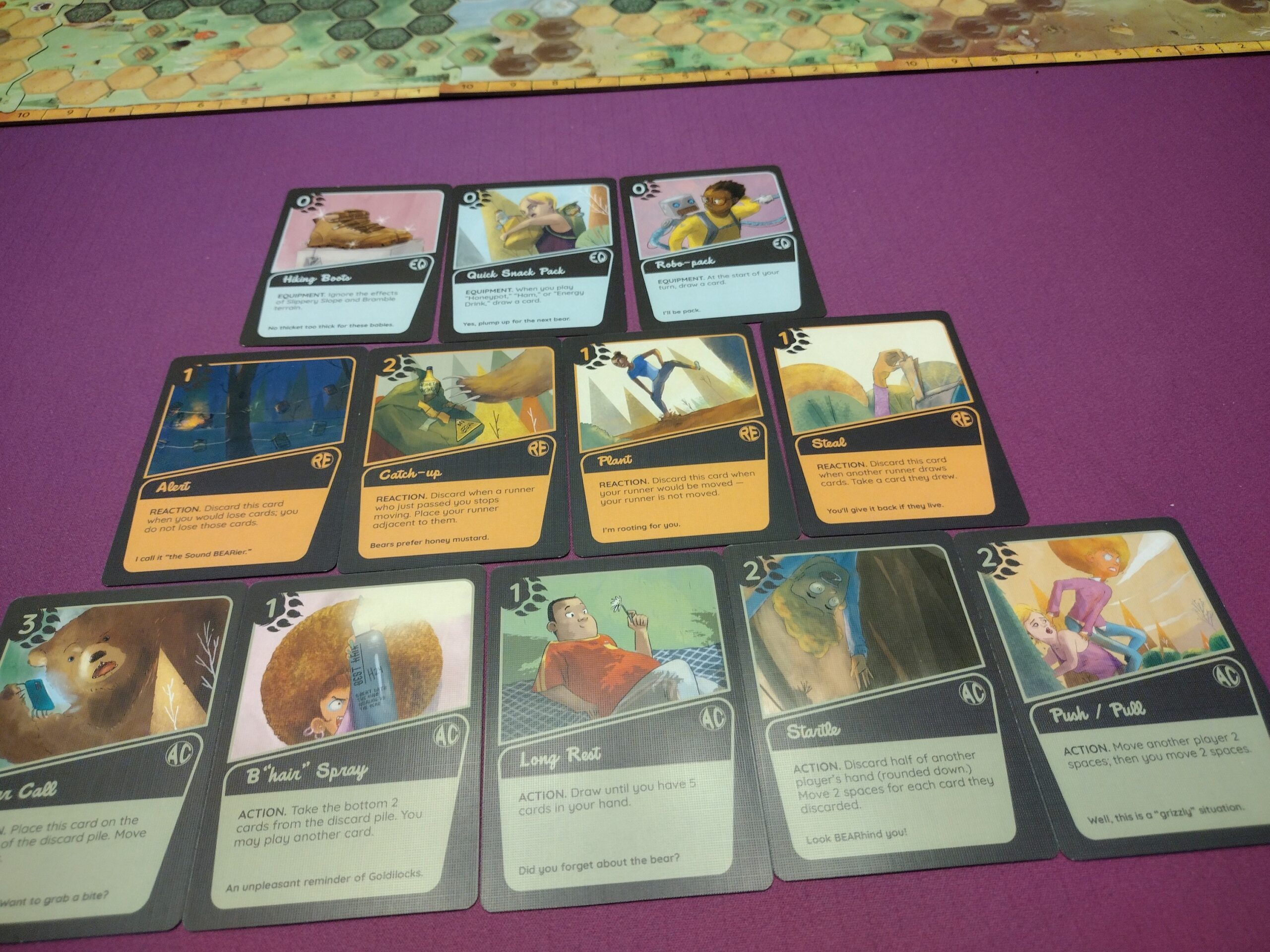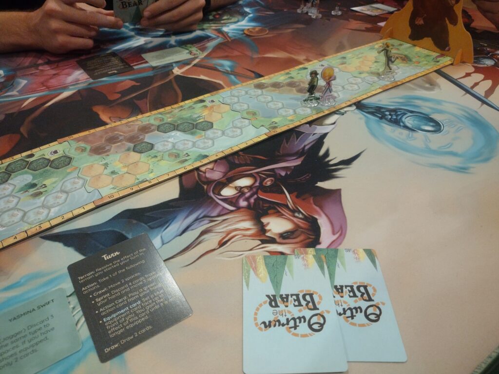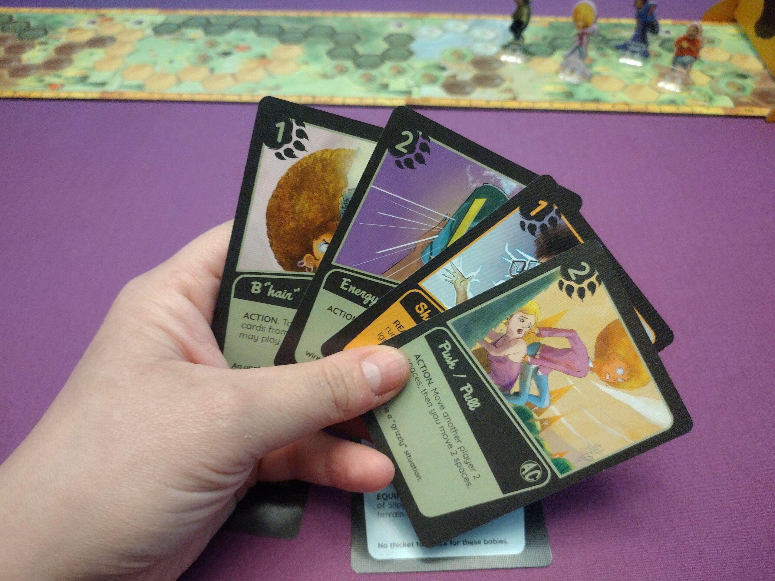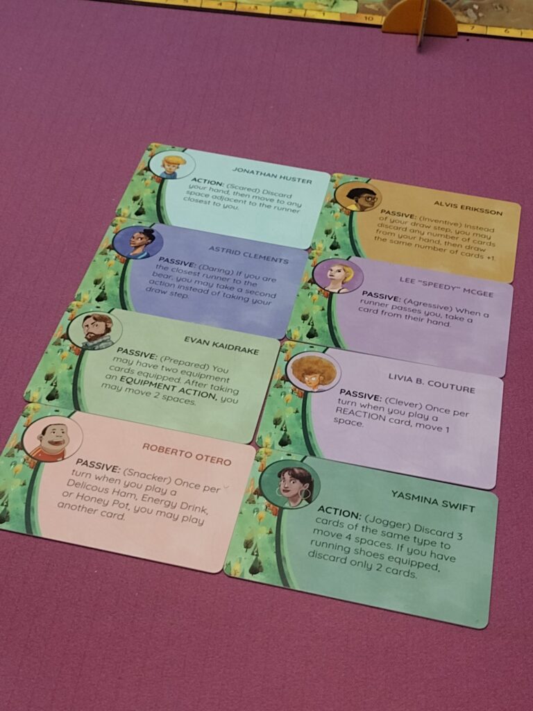 • Luck – Cards can let you move other players, or prevent players from messing with you, they can let you steal cards, or prevent that… et cetera. So there’s a fair amount of luck of the draw and a player can definitely have a few bad draws which could let the bear catch up with them