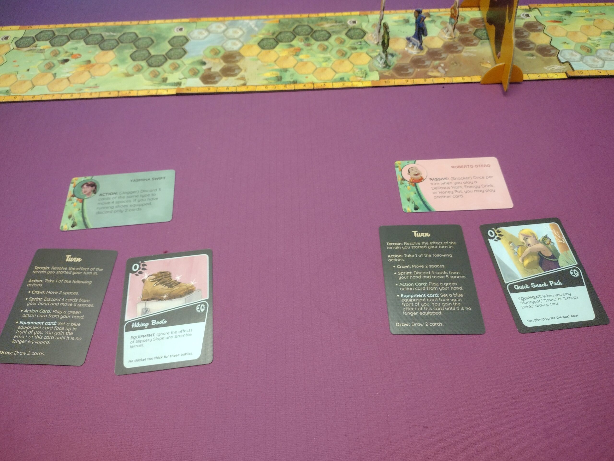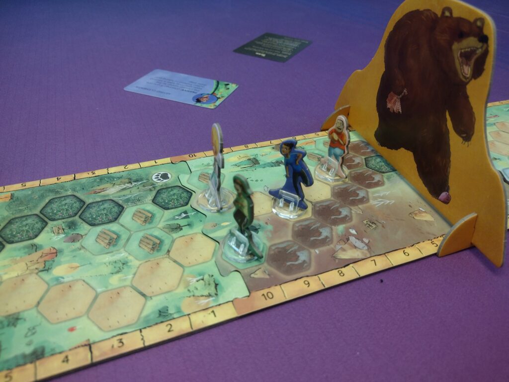 Grid Movement – Players will move along spaces on the board to try and outrun the bear. At the beginning of each turn, players will need to resolve the terrain they start on which will move them forward or backward, restrict their movement, or allow them to play an equipment card.