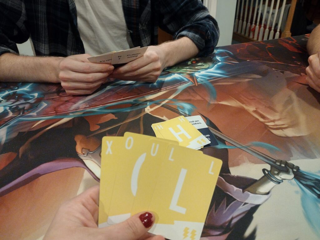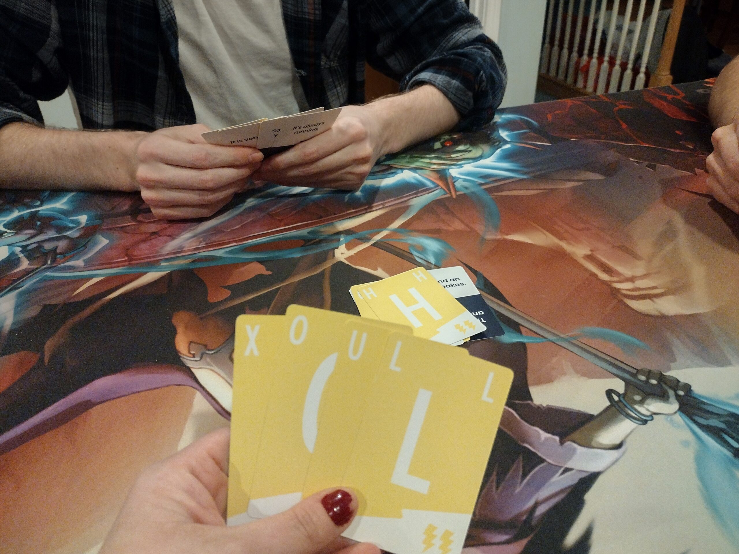 Speed-Based Party Word Game – Players start with 5 letter cards in hand each round. A new theme is revealed to start the round. They must think of a word or sentence starting with a noun or verb that starts with one of their letters in order to play a card.