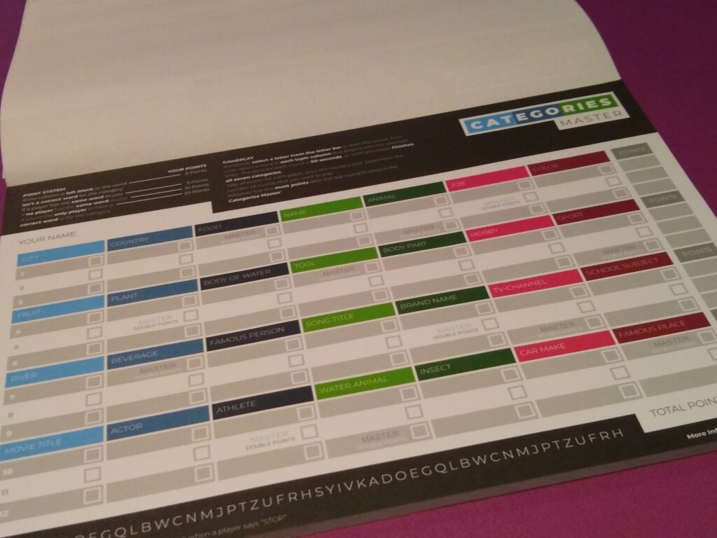 The game is just a pad with 50 tear-off pages; simple but gets the job done. The sheets are large (12×9″), which is nice for writing on, but does make it a bit difficult if you like to laminate writing game sheets, like I do. The pages also tear off very easily and nicely, which is great, of course.