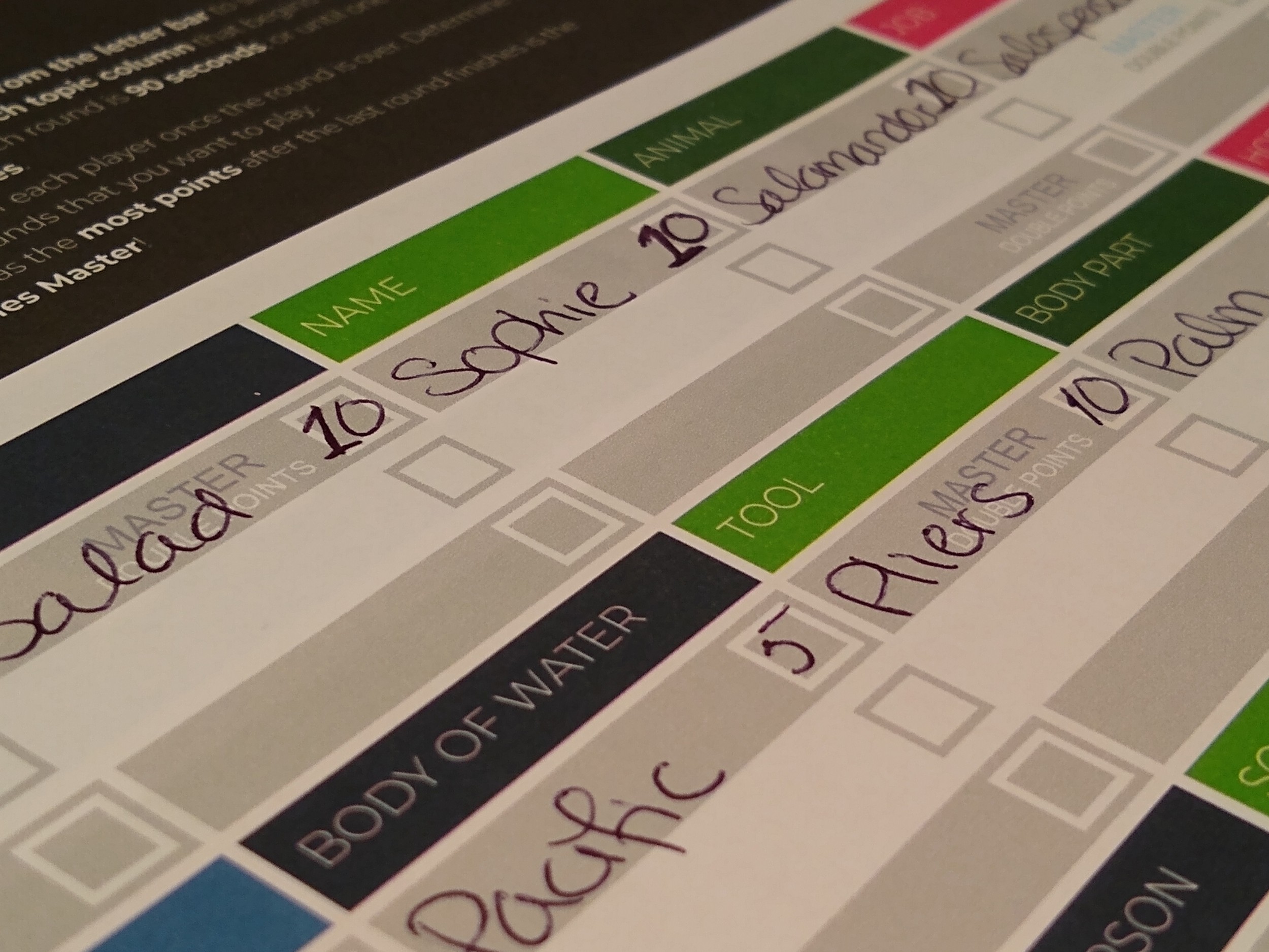 A word game similar in style to Scattegories, and based off the classic game CATEGORIES (City, Country, River), popular in Europe. Players work under a time restraint and are tasked with thinking of 1-word answers in multiple categories, all starting with the same pre-determined letter. They’ll score points for every valid answer, and will score better for unique answers, and even better if they are the only player with a correct answer in a category. After a number of rounds (you decide how many before beginning), the player with the most points wins!