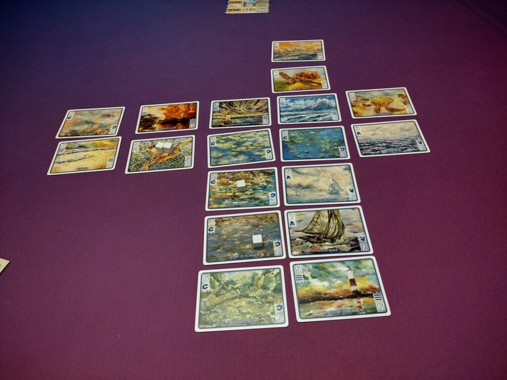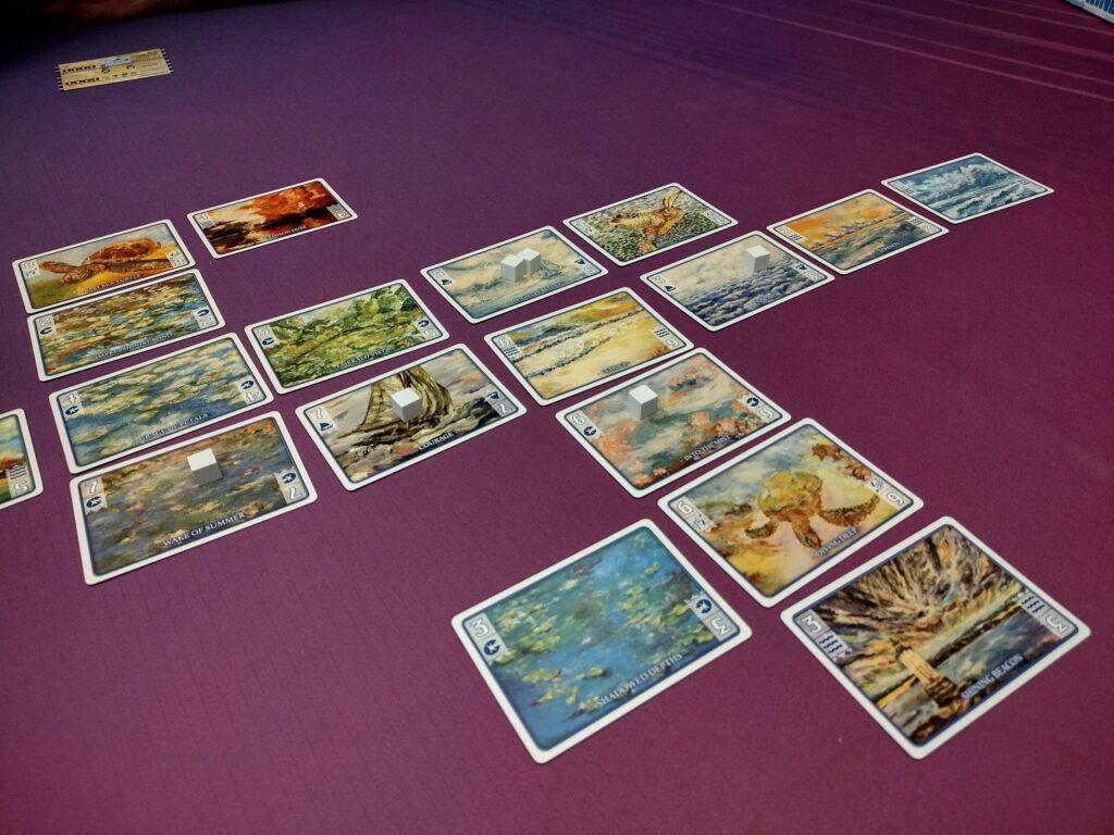 Tile Placement – Each turn players will place a new card into the display, adjacent to another. It goes face up if next to a face down card, and face down if placed next to a face up card