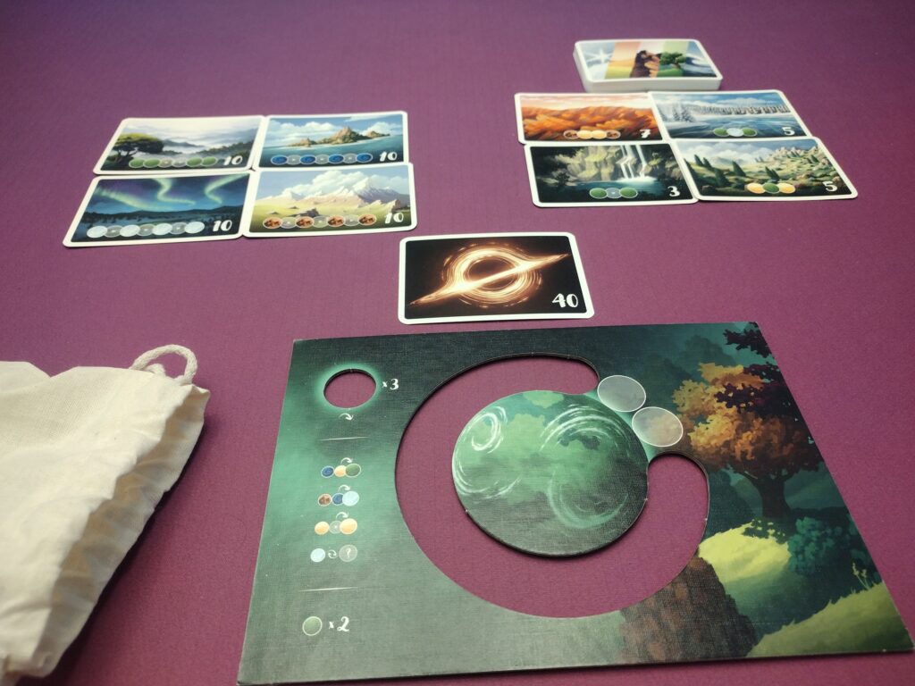 Solo – Play against the Black Hole which starts with 20 (Family) or 40 (Standard) points. Each round, the player takes out 3 tokens from the bag, keeps 1 and gives 2 to the Black Hole. The Black Hole can complete 1 biome card per turn, and ignores joker symbols and position of terrain, but must spend the tokens used to complete biome cards, so may only use them once. – Really nice little puzzle. It can be tricky to balance what you keep with what you give the Black Hole, especially because they get more tokens than you each round, but it’s fun to weigh your options to try and avoid giving them too many biome cards. It’s interesting, and has a really nice flow.