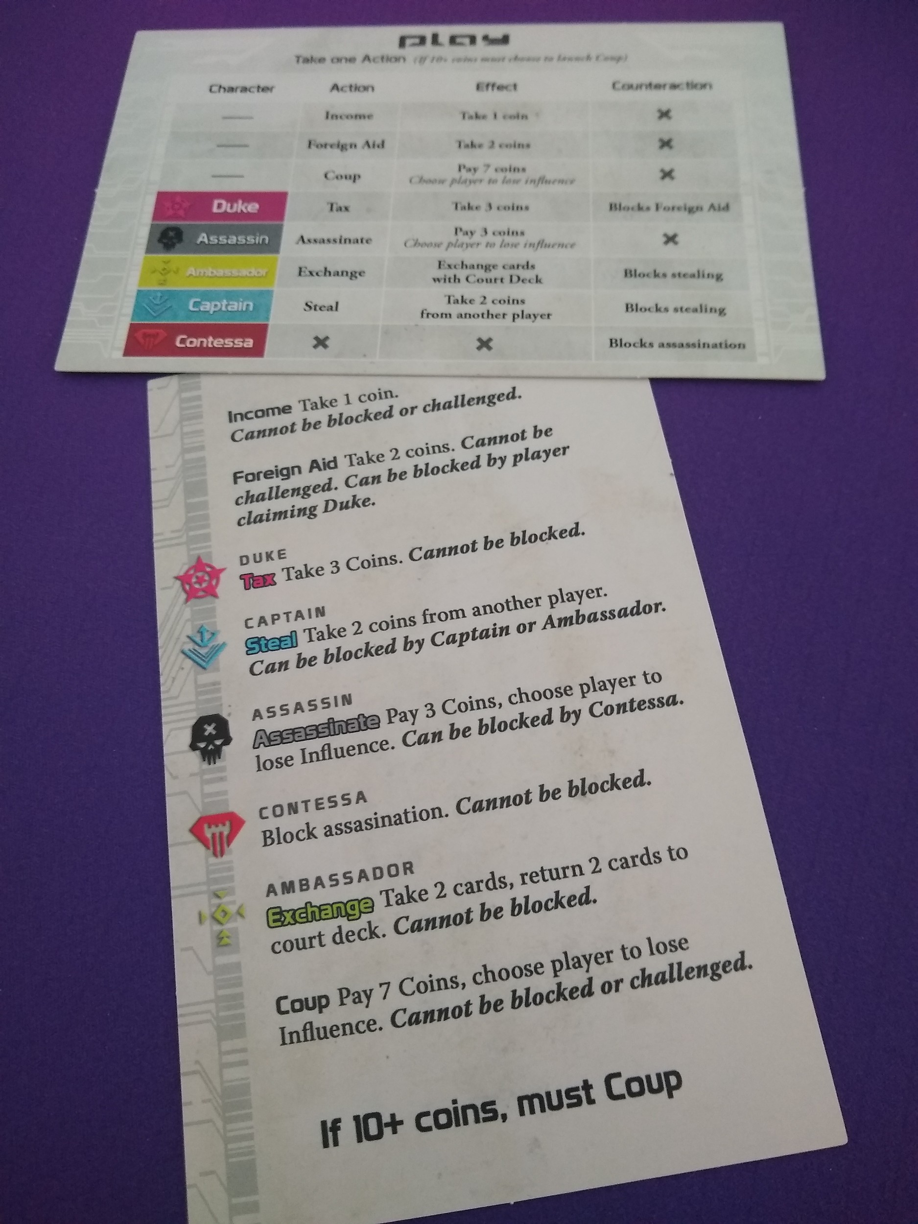 A hidden role game where each player starts with 2 hidden influence (roles), each with their own special actions. Players can use actions to collect coins, take out opponents, and even switch their role cards. The twist? Players can take any actions, no matter what roles they actually have, by bluffing and convincing their opponents that they have certain roles. But players need to be careful. If an opponent calls you out and finds you’re lying, you’ll lose an influence and be that much closer to elimination. Ultimately, you want to be the last player standing.