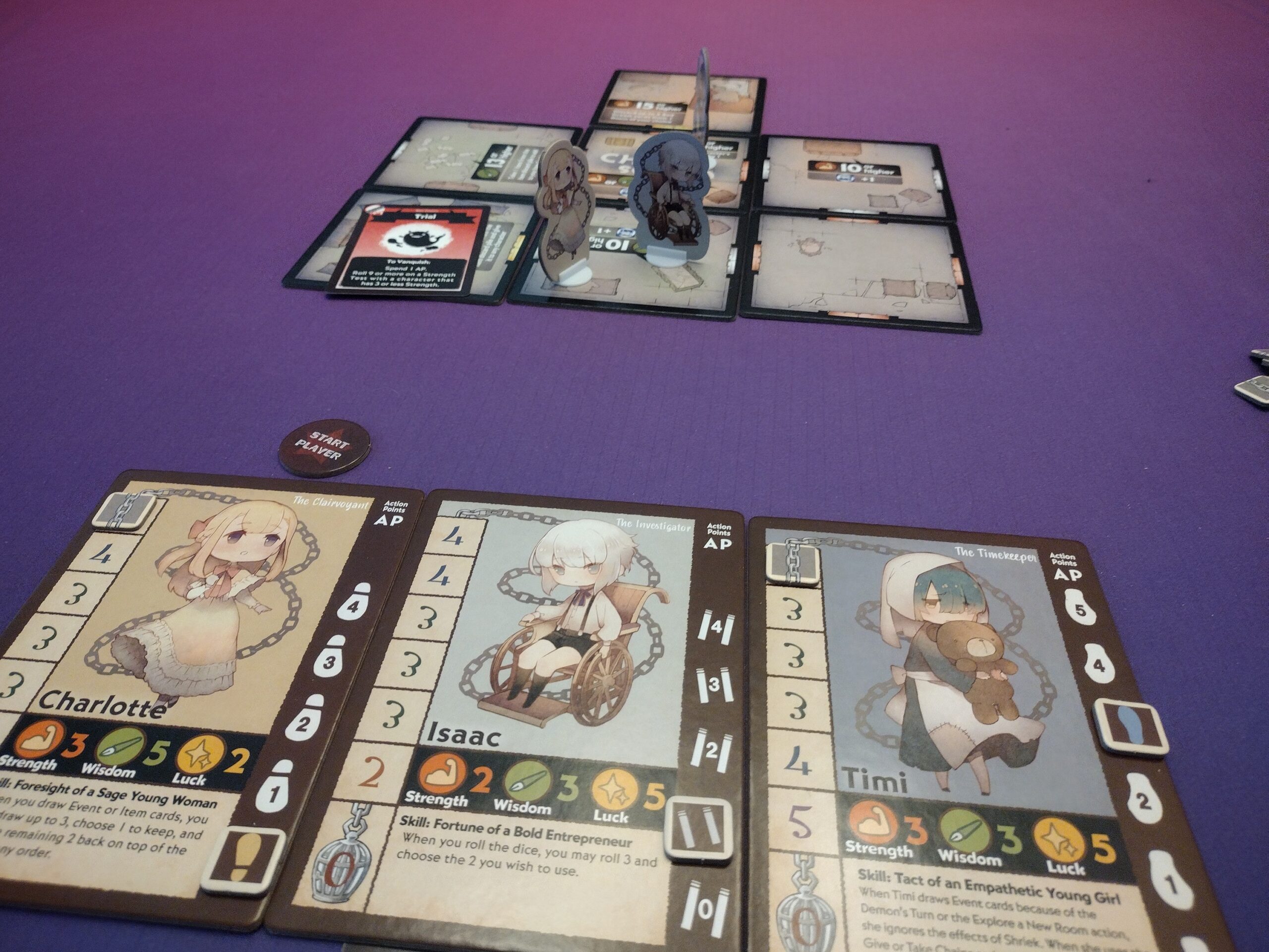 - 1 to 4 Players – I thought it worked okay at any count, but thought it was best at 1 or 3 because you play with 3 characters, and you get a little boost during set-up because you put out 3 tiles that you don’t have to draw events for, so it just felt more managable