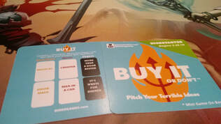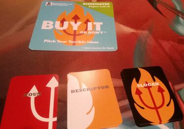 Buy It or Don’t is a quick, simple, and light party game for medium to large sized groups. Similar to Cards Against Humanity in mechanics (combining cards to come up with the funniest/best/wittiest combo), and Snake Oil in theme (pitching/marketing ideas and products), this game is silly but allows for some great levels of creativity.