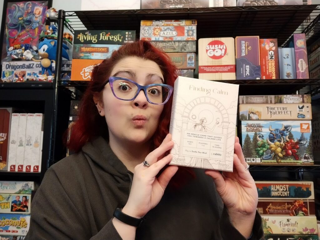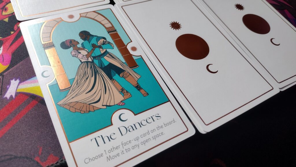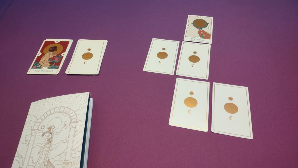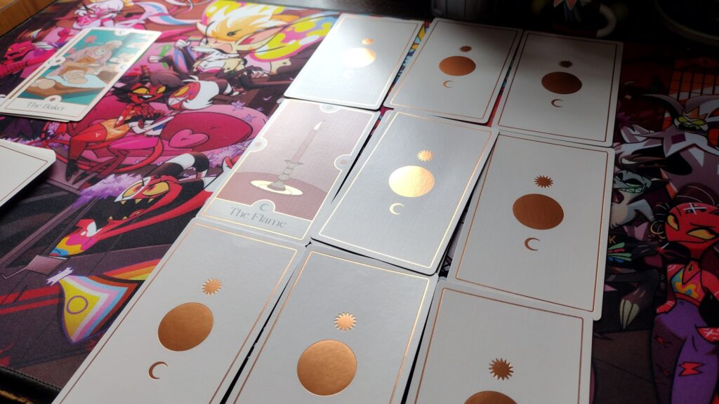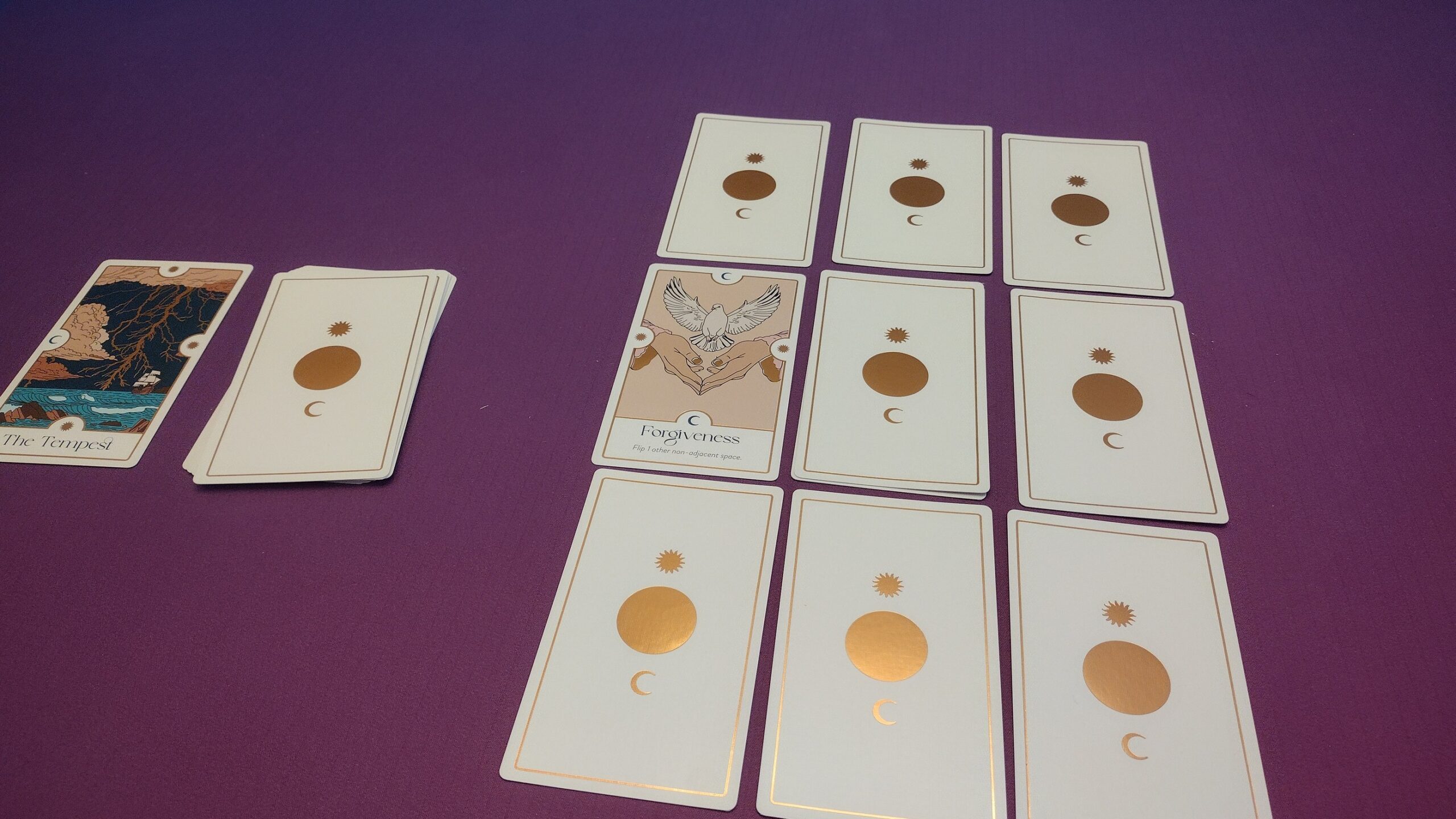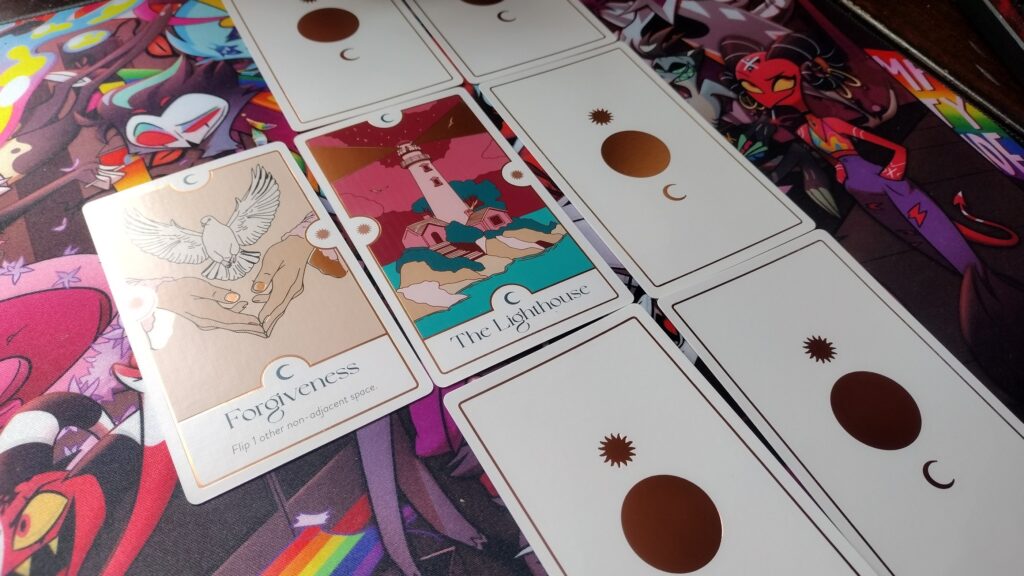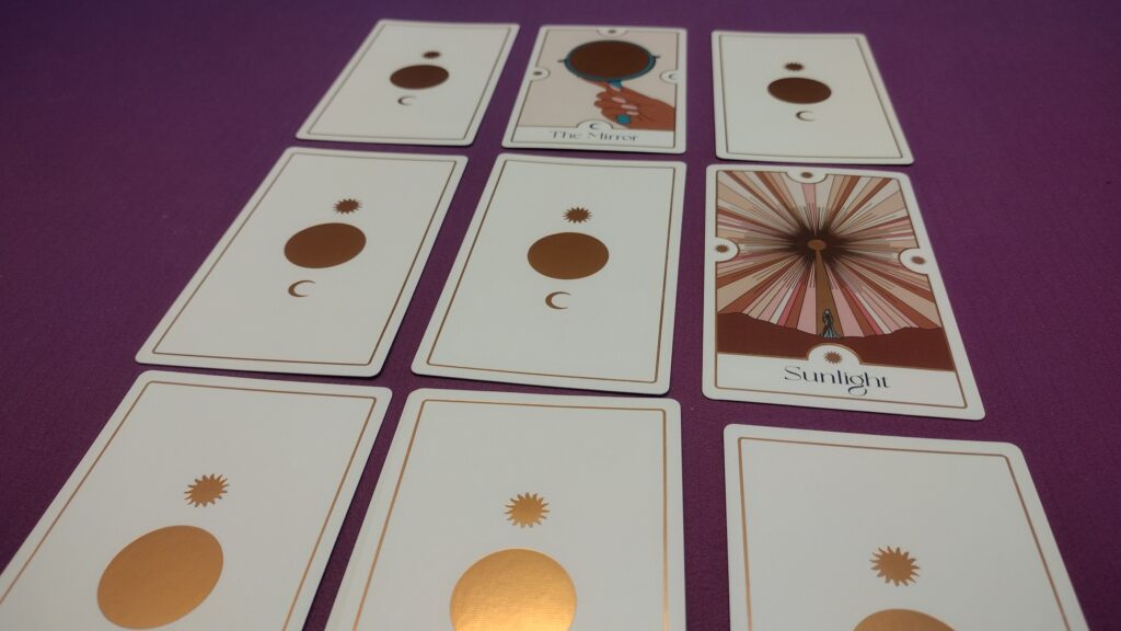 3×3 Grid / Puzzle Game – The player(s) will choose each turn before drawing a card if they want to place it in the grid, or move a card already in the grid (discarding the next card from the deck instead). Placing sun symbols facing other cards will cause those cards to flip, and ultimately, the goal is to have only a single card face-up. The game ends if the 9 spaces of the grid are filled, or if the deck is emptied. Then, the player(s) can look up their day’s intention in the rulebook based on what card is face-up and where. (If there are multiple cards, players will just choose one as their intention).