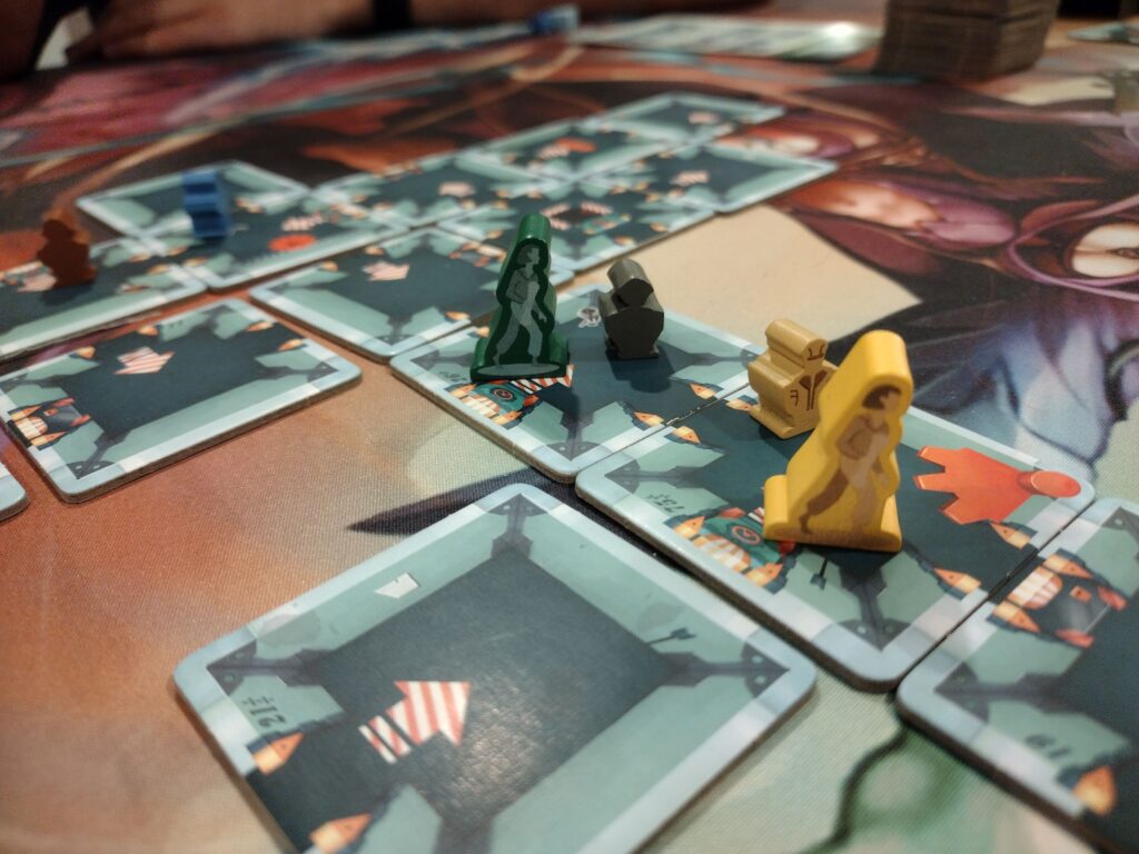 Tile Laying – You’ll build out the map of the mechanical beast as you move through it by laying out tiles from a large stack. The arrows determine their orientation, and you will have various paths available to you through doorways, or blocked off due to locked doors/walls. Players need to find the control room to shut the beast off, then get back to the entrance or emergency exit with all the people they found along the way in order to win.