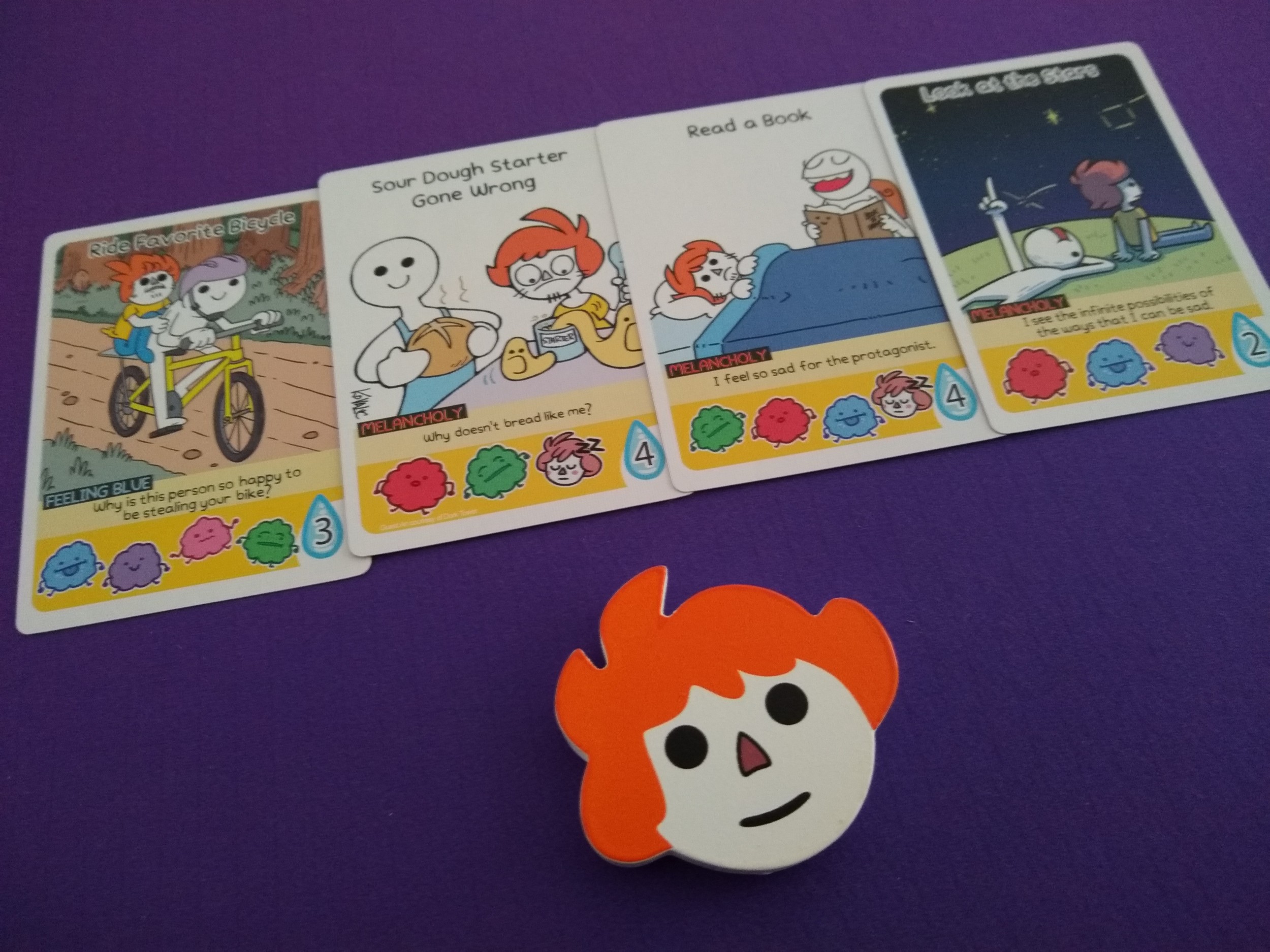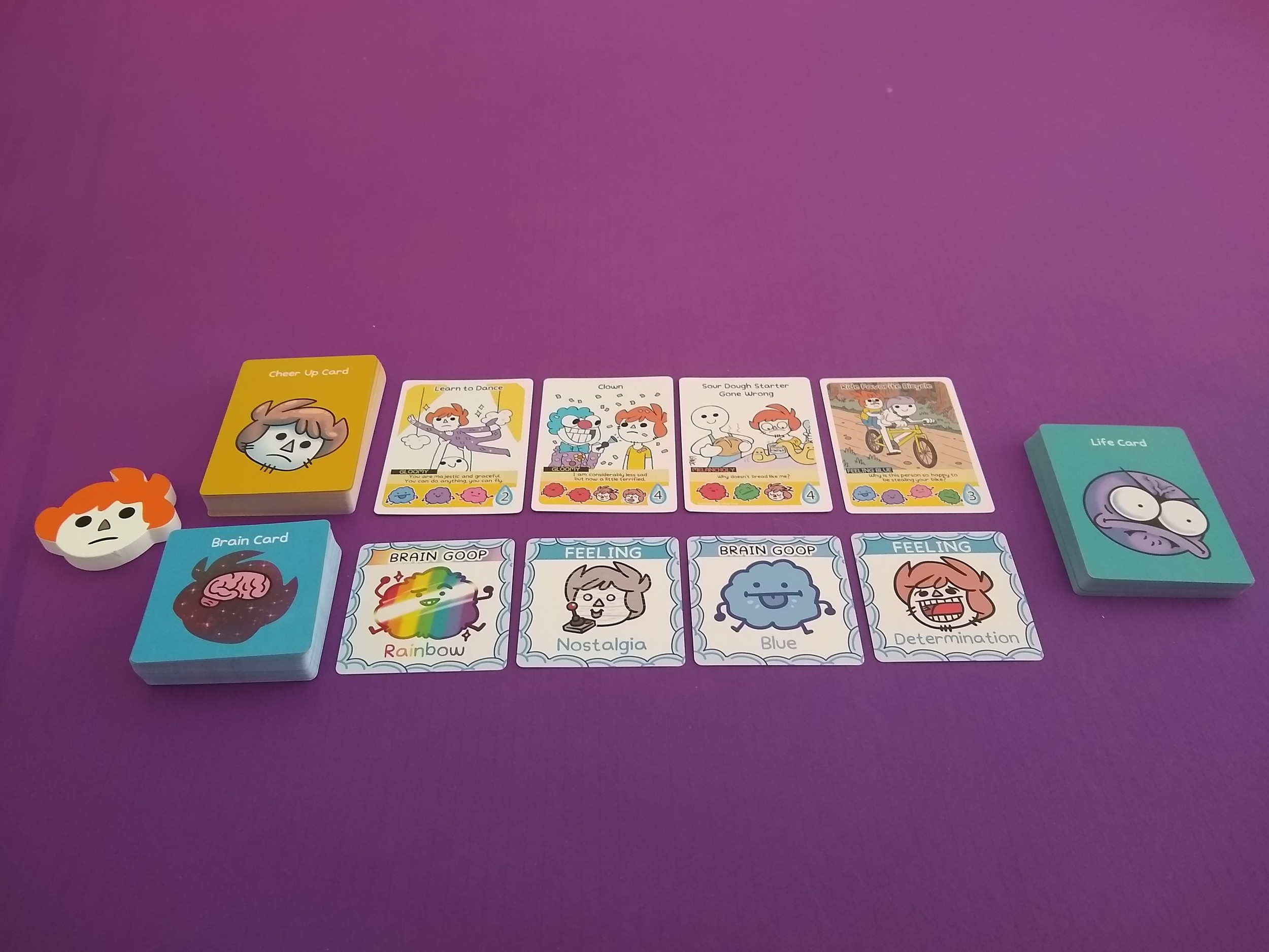 A hand management and set collection game for 1-4 where players are trying to get the right sets of brain cards in hand to collect cheer up cards and work their way toward cheering up their friend. They may also get some life cards along the way the way, which might give them a special ability … or might hurt them somehow – life’s unpredictable that way. A player wins when they’ve earned 13 cheer up points, or have a set of 3 of the same type of sadness on their cheer up cards, and they earn the privilege of flipping their friend marker over to the happy side!