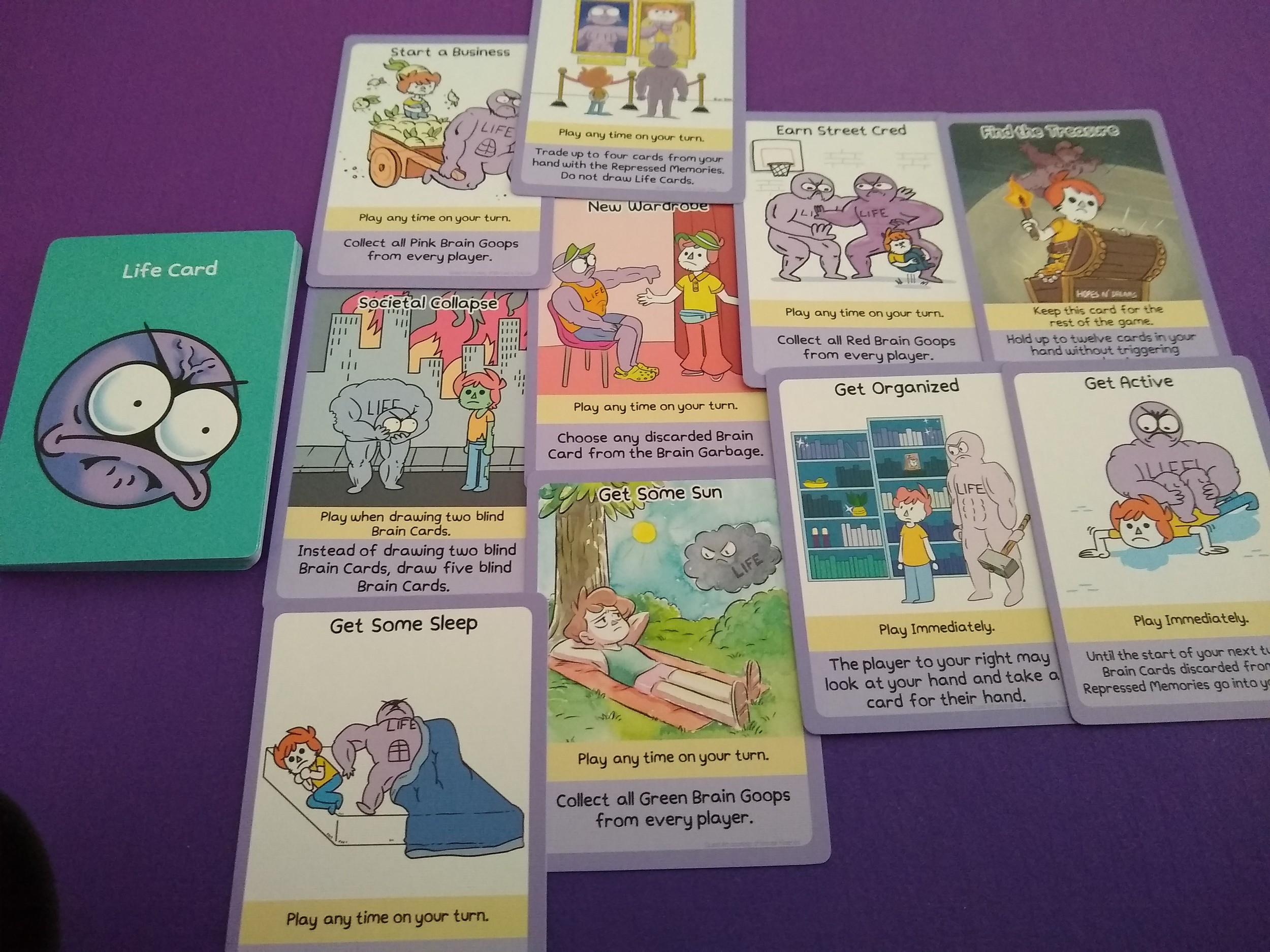 The game is mostly cards, and they have an overall nice quality; they have a nice finish on them as well. The life and cheer up cards are well designed, very clear on what they do / need. The brain cards are square and smaller, which I wasn’t big on. It’s hard to tell what you have in hand without frequently flipping through them. The brain goops have colored lines up top, which help, but the feeling cards are (also) blue and you don’t know which feeling it is until you see the image or text at the bottom. The art across all the cards is awesome, very aesthetically pleasing.
