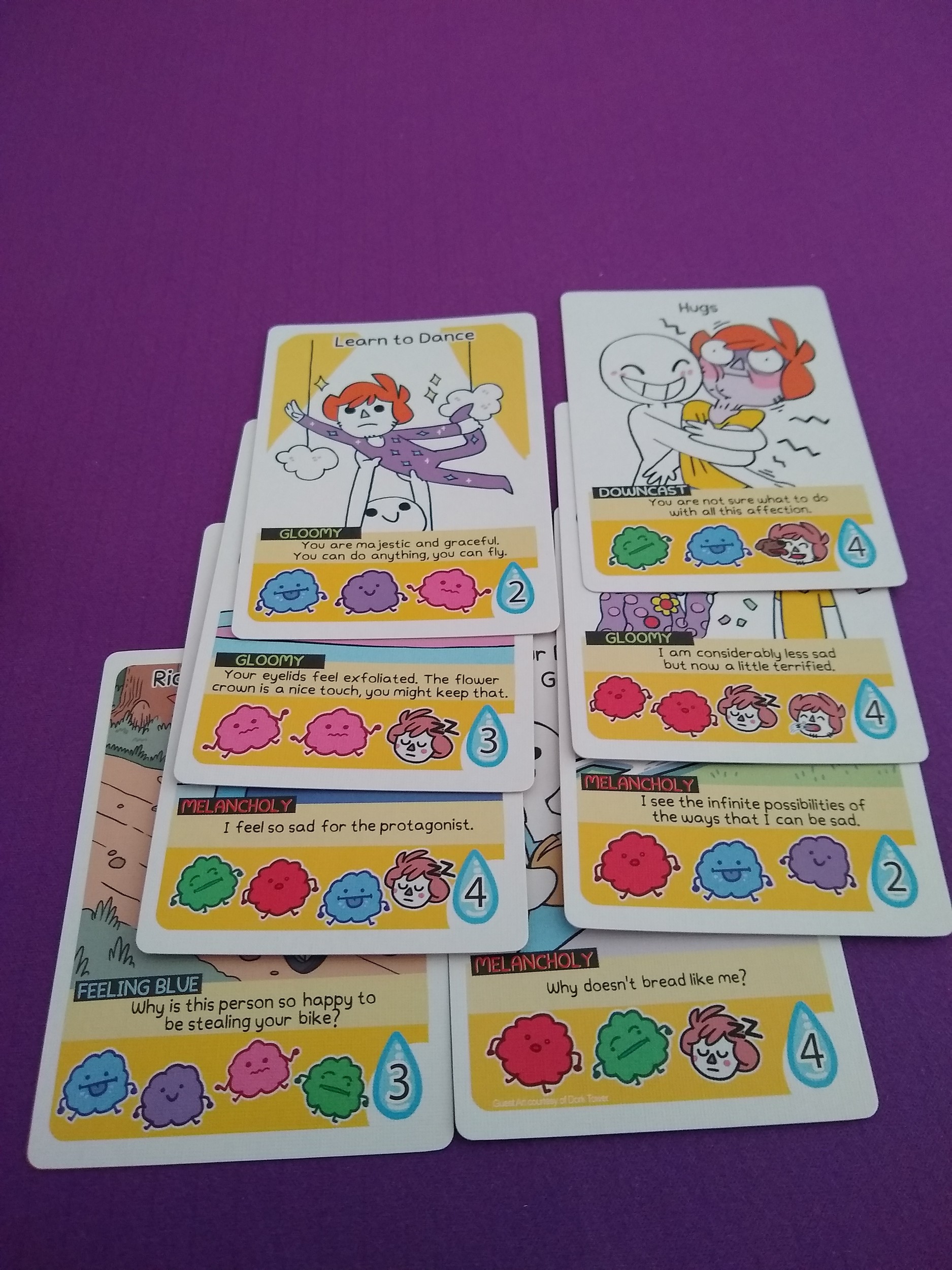 While this game can be pretty luck heavy, and has a bit of “take-that” between players at times, I thought it was pretty cute, and simple enough to play with just about anyone. The concept is relatable and, while a little tongue-in-cheek, doesn’t make light of a serious topic. It’s good for a filler game, or maybe something to try with friends or family who aren’t into heavier stuff, or even with kids to teach them about cheering up a friend 🙂