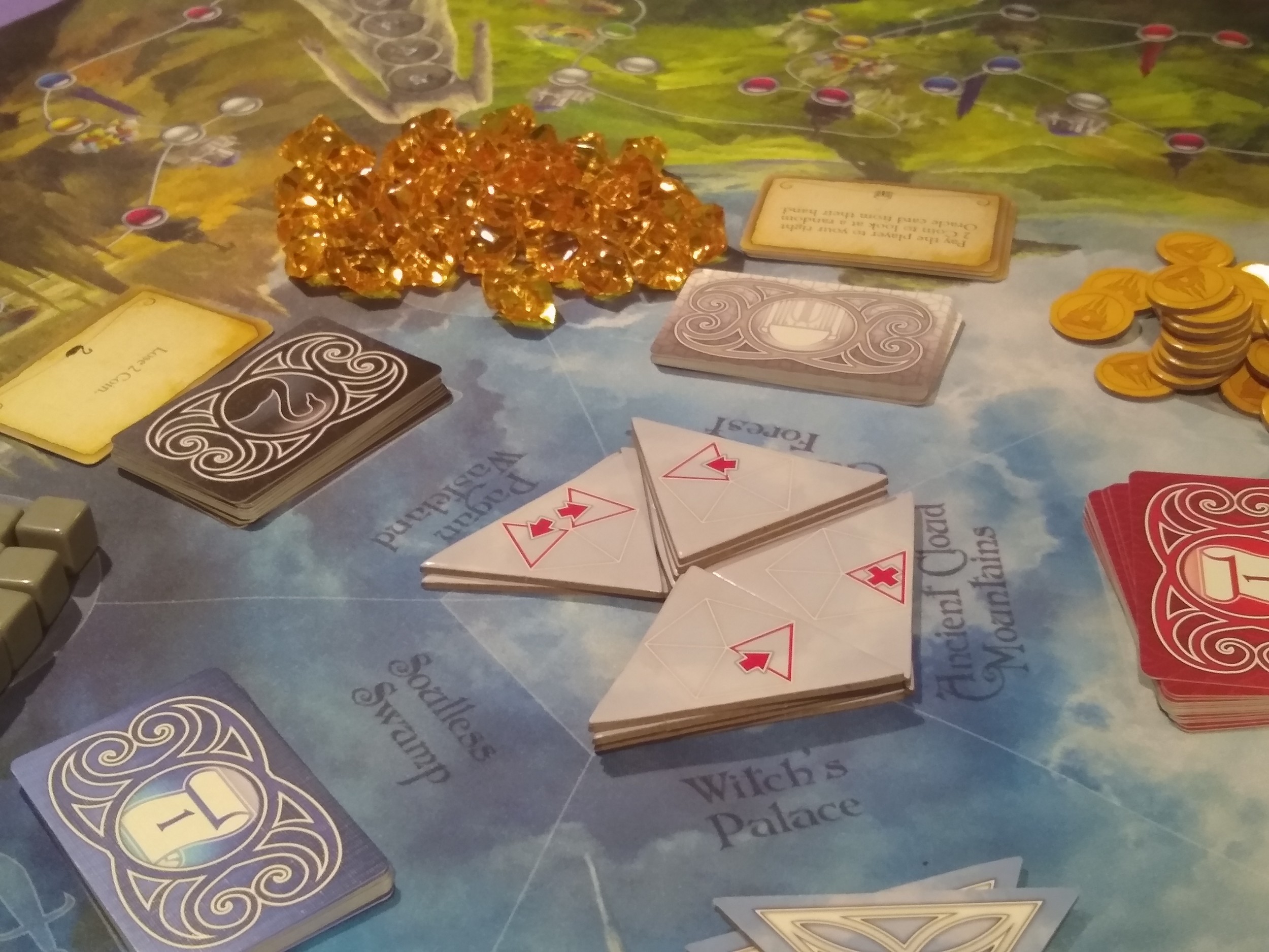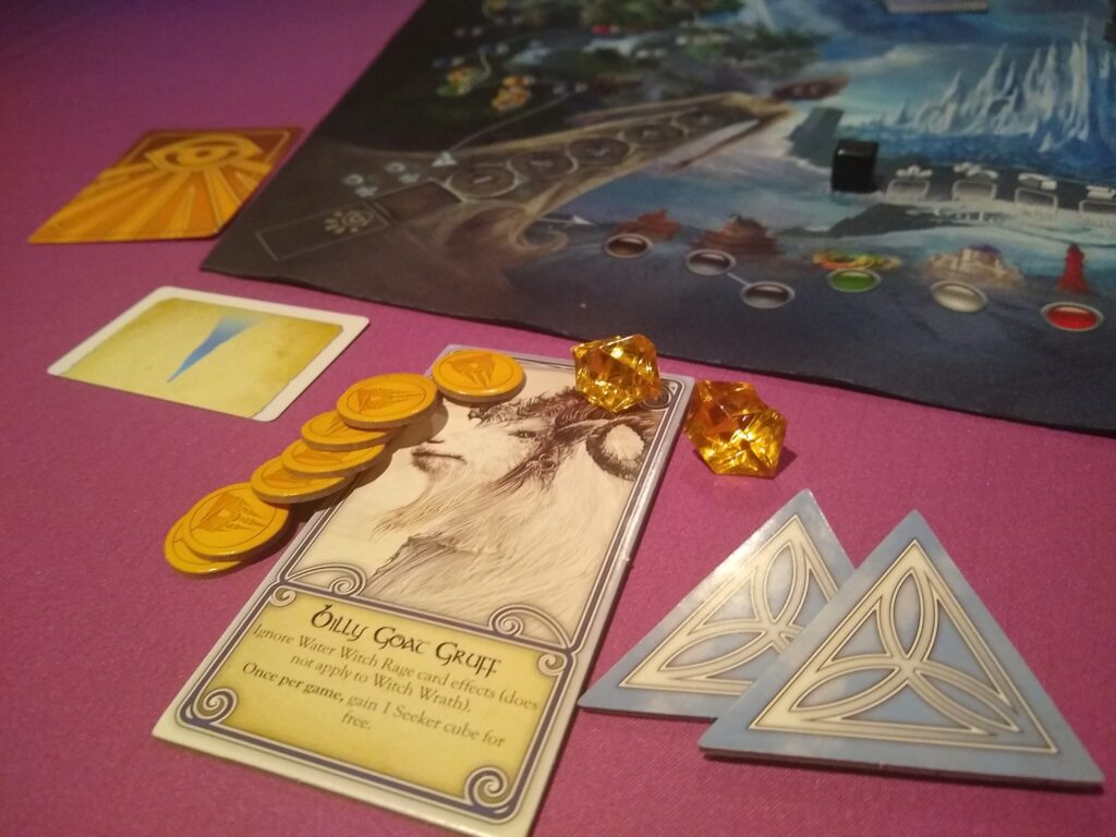 There are a variety of cards – scrolls, Oracle, truthseeker etc. – all average quality. The Water Witch envelope, for hiding the chosen enemy and weapon cards, was a little tight in my opinion, so just be careful when putting the cards in there. The cardboard pieces – coins, Hero tiles, hideouts, etc. – are average cardboard; everything on the tiles is easy to read/understand as well. The seeker cubes are just some basic plastic cubes, nothing special, and the mana crystals are the standard gems you see in a lot of games, which are pretty nice, and they’re a pretty orange color in this one.