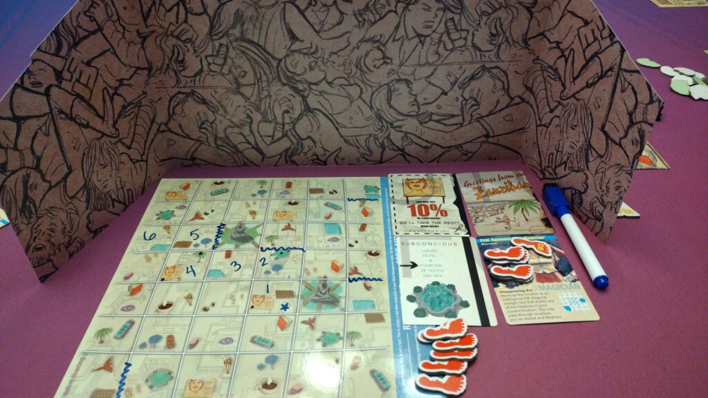 Hidden Movement – The recruiter is secretly moving around the game board (marking movement on their hidden sheet) and the rogue agents are attempting to figure out where the recruiter is in order to use the “capture” action while in the same spot as them.