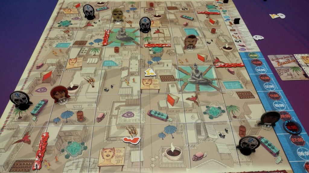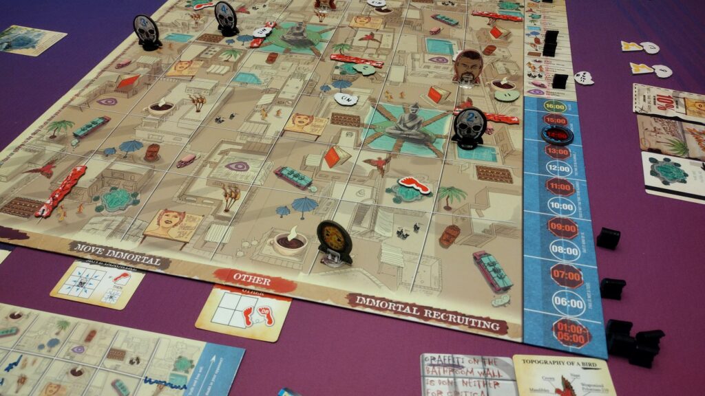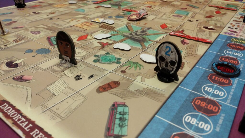 Deduction – The rogue agents can get clues throughout the game using “ask” and “reveal” actions to learn where the recruiter has been and when. They’ll need to use some deduction skills to figure out unrevealed information in order to capture them before time is up.