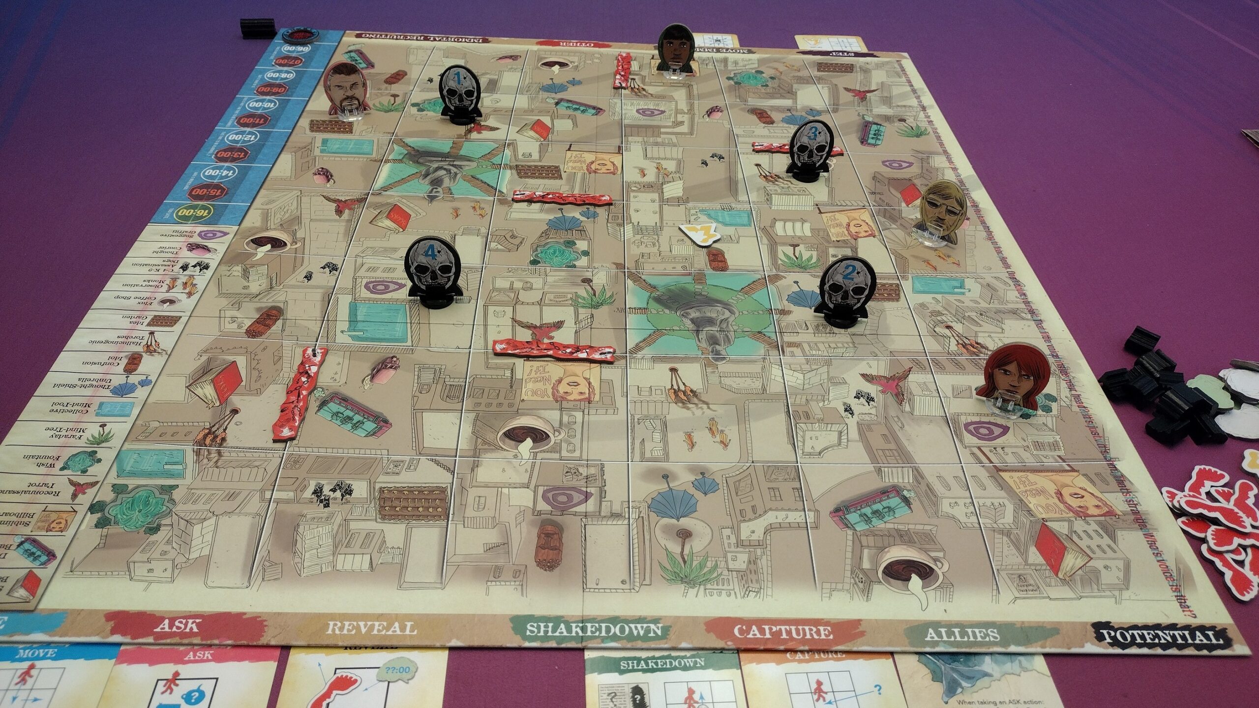 Deduction – The rogue agents can get clues throughout the game using “ask” and “reveal” actions to learn where the recruiter has been and when. They’ll need to use some deduction skills to figure out unrevealed information in order to capture them before time is up.