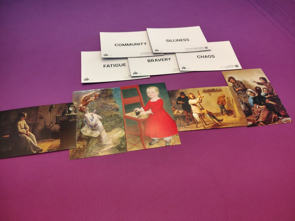 ⚙️Limited Communication / Deduction – “The Vibe” player selects a theme from 5 random ones and puts 5 random images in order from least to most fitting of the theme. The other players – Mind Readers – discuss and guess which theme it is, without any additional clues from The Vibe