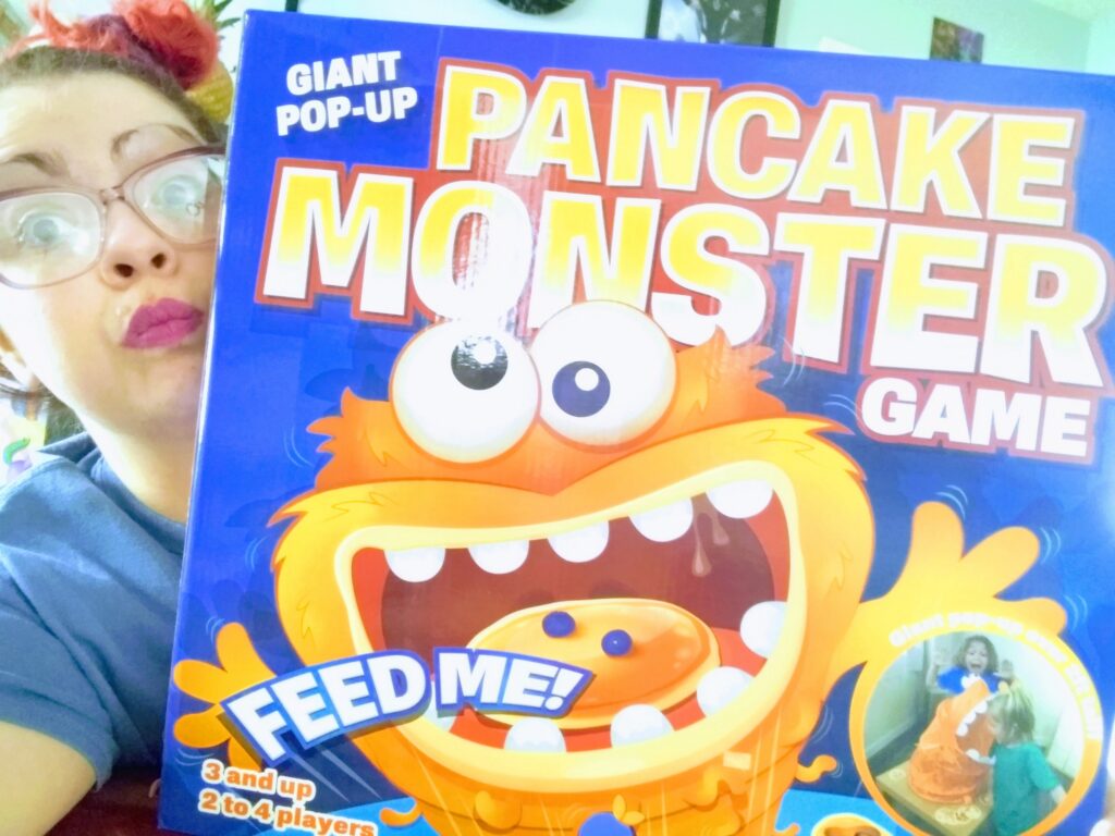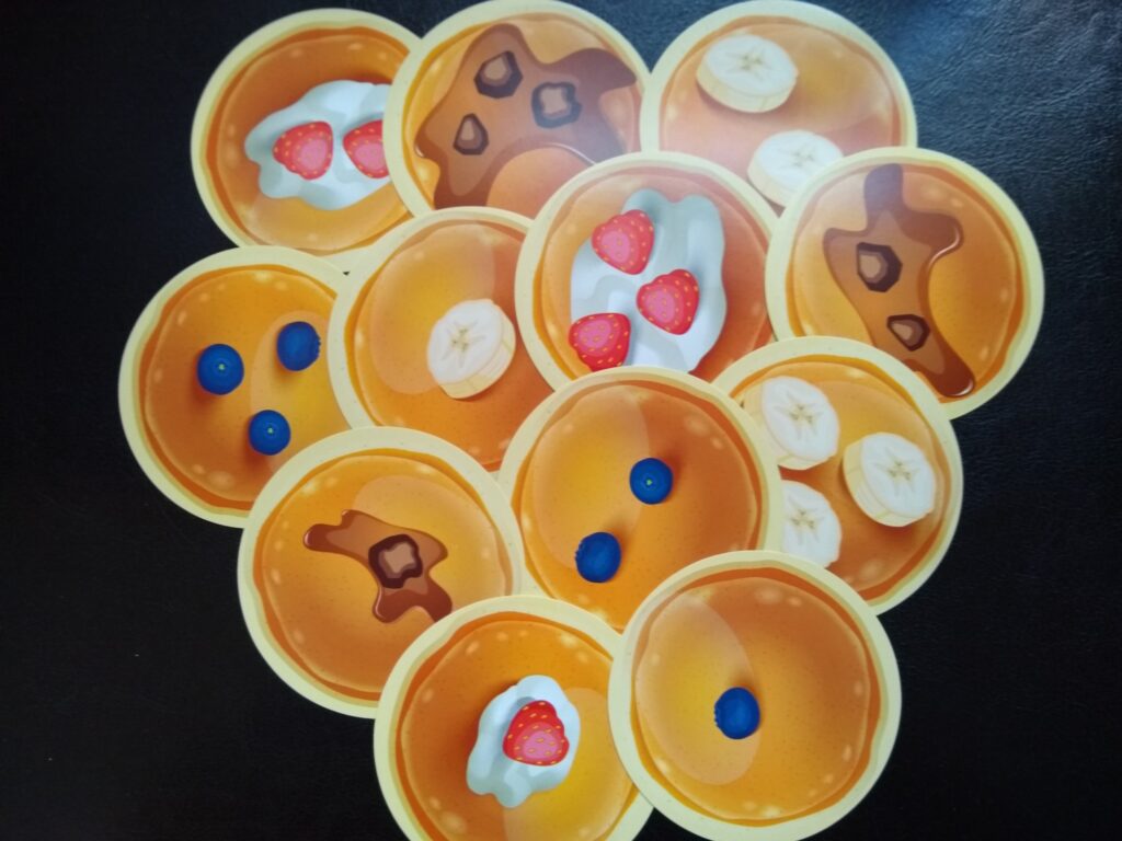 Laundry – Each player gets any 3 (clean) articles of clothing from around the house. It plays much the same as the normal rules, except players must feed the monster a pancake with the same flavor as the player before them in order to feed the monster their laundry. The first one to get rid of all their laundry wins! It’s a small but cute twist on the game that teaches small kids a bit of matching!