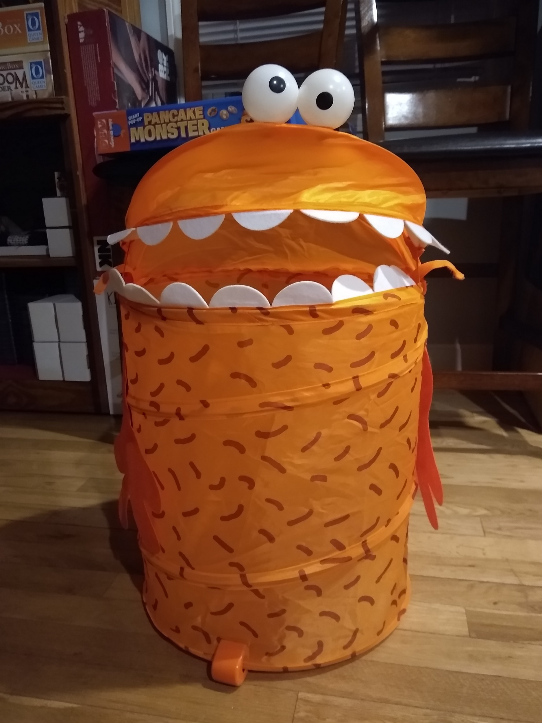 A children’s game where players feed pancakes to a hungry monster! As they do, they will click the button in its mouth a number of times equal to the number of toppings on their pancake. If the monster doesn’t pop up, the player is safe, and play passes to the next player. But … if the monster POPS, then the player must collect all the pancakes in the monster’s belly! The first player to get rid of all their pancakes wins!
