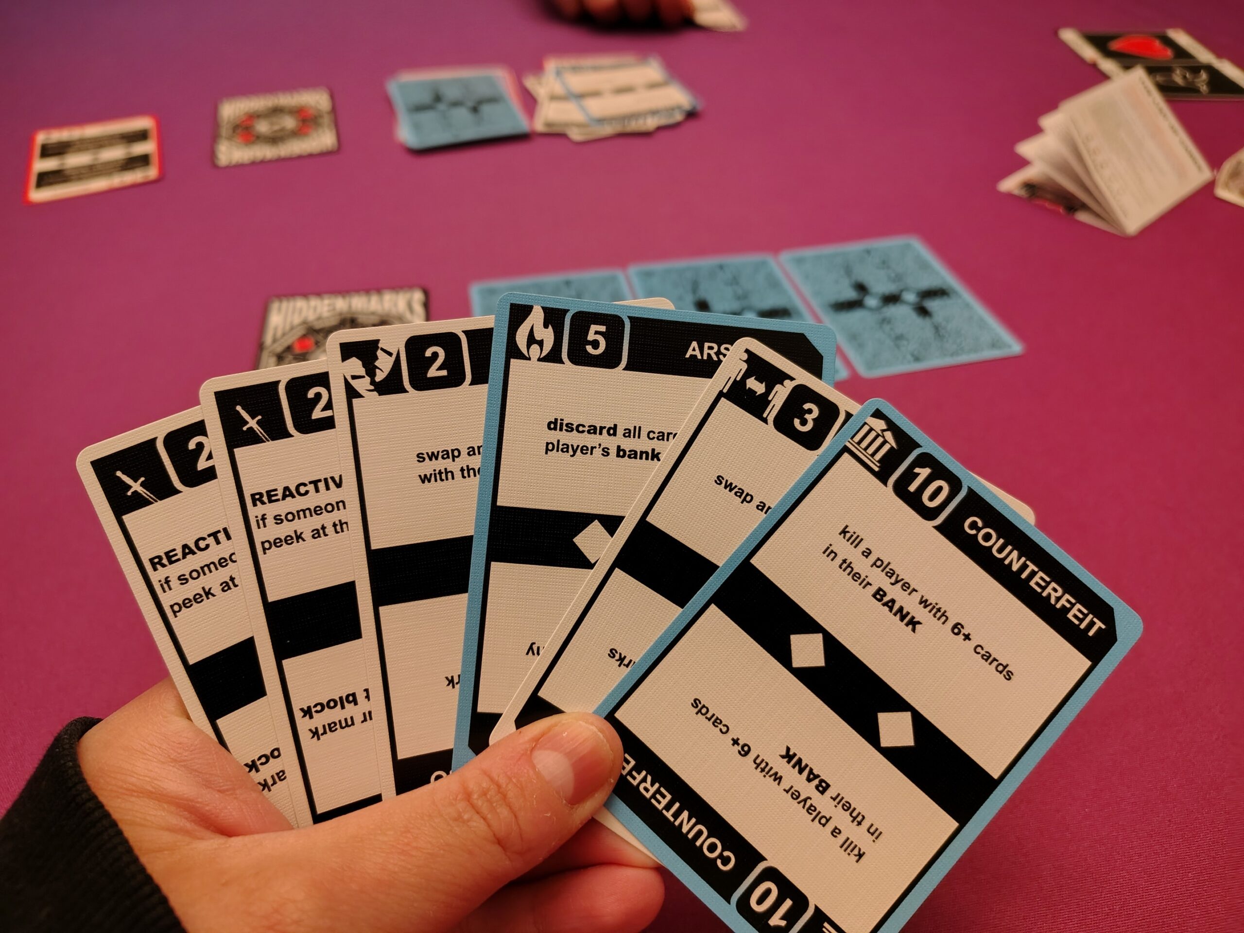 ⚙️Hand/Resource Management + Multi-Use Cards – Cards are used for money and abilities, so players have to choose what to keep in hand, versus use for money. Some cards can also eliminate players who have a certain number or color of cards in their hands or bank, so hoarding cards isn’t always a great strategy either.