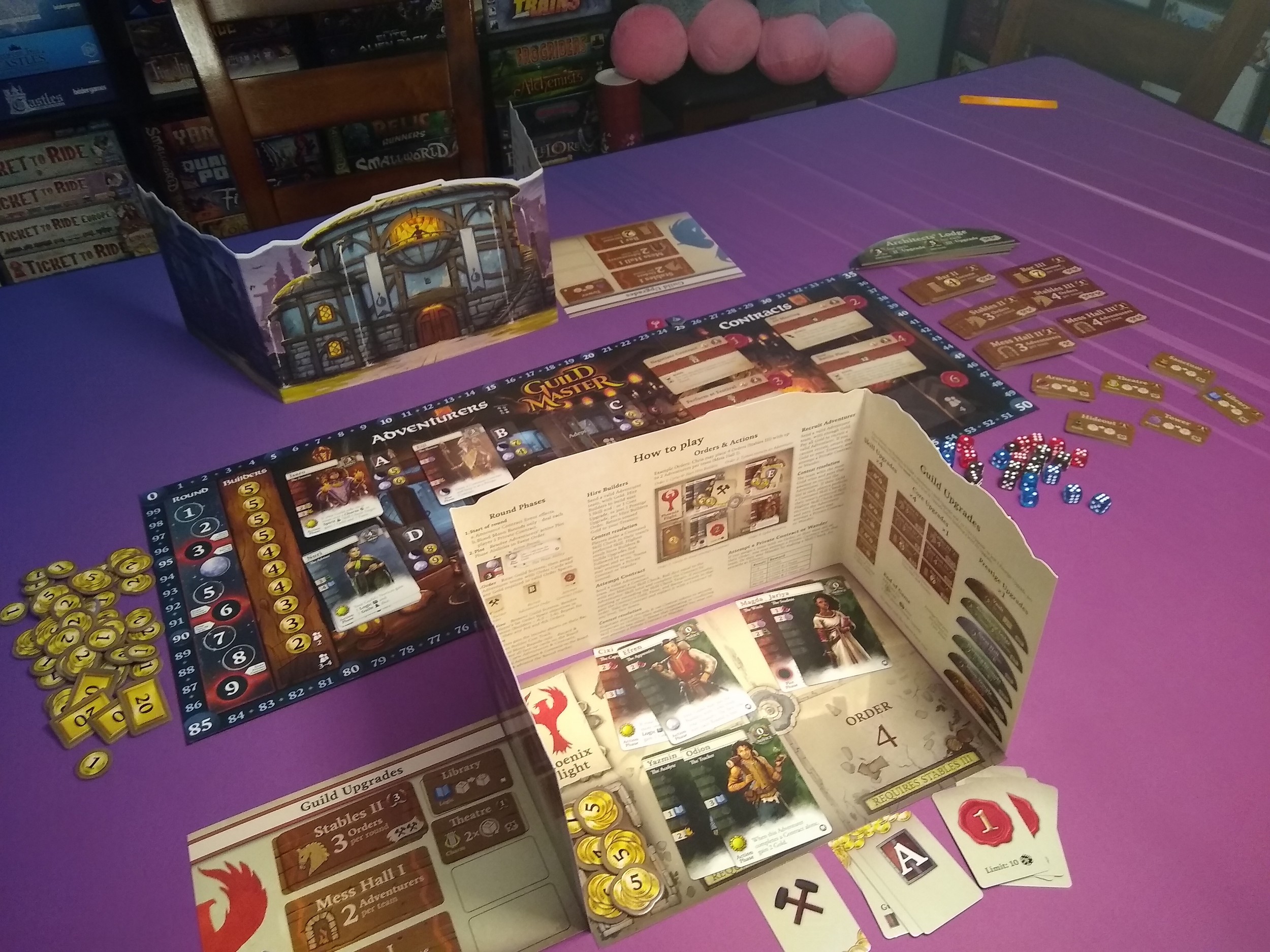 A fantasy board game for 2-4 Guild Masters who are building and managing an adventuring guild, and competing to have the most fame. The game takes a myriad of mechanics and features including hidden action planning, negotiation, bidding, dice rolling, take that, variable player powers, and more, and weaves them together really well.