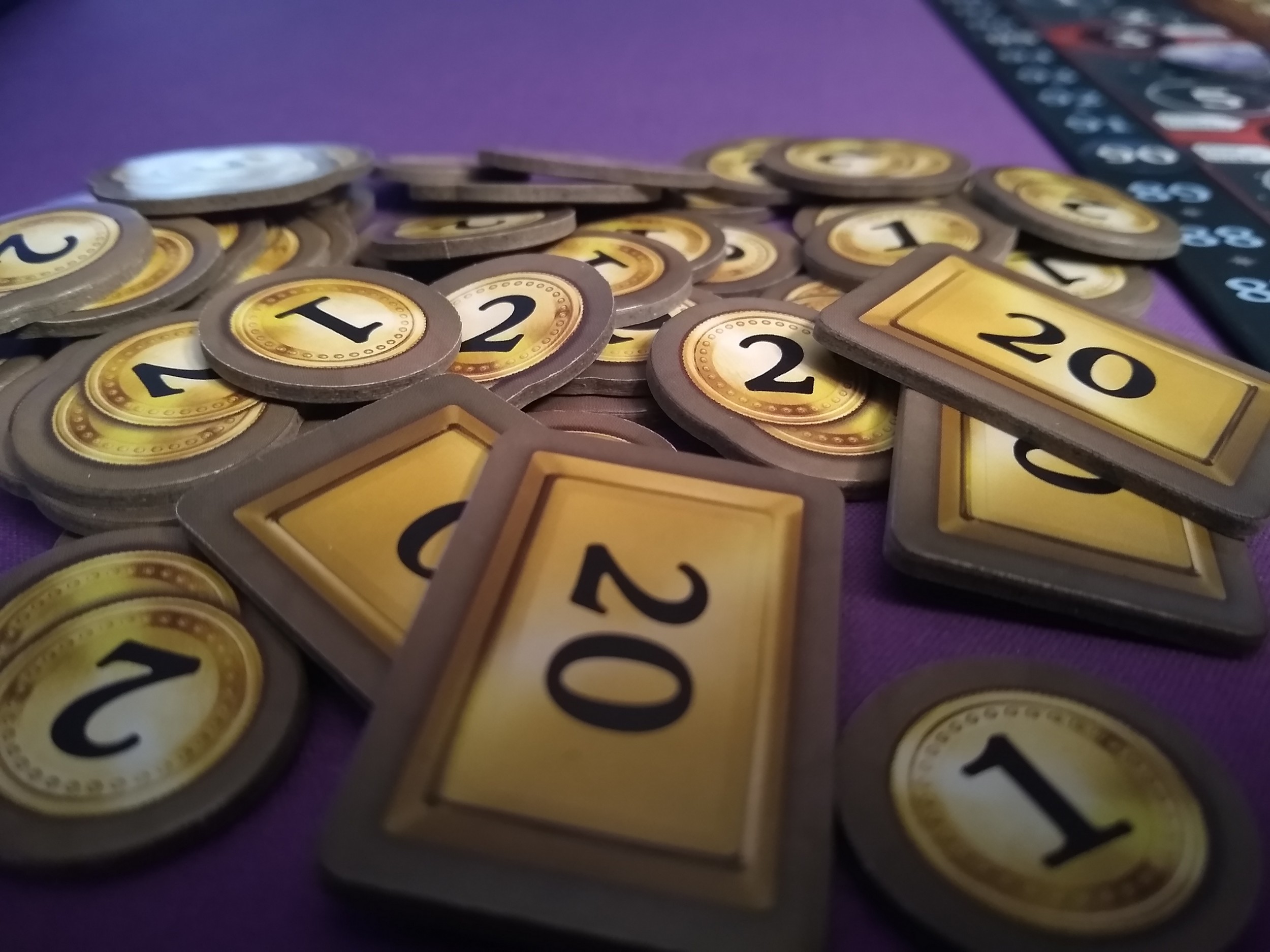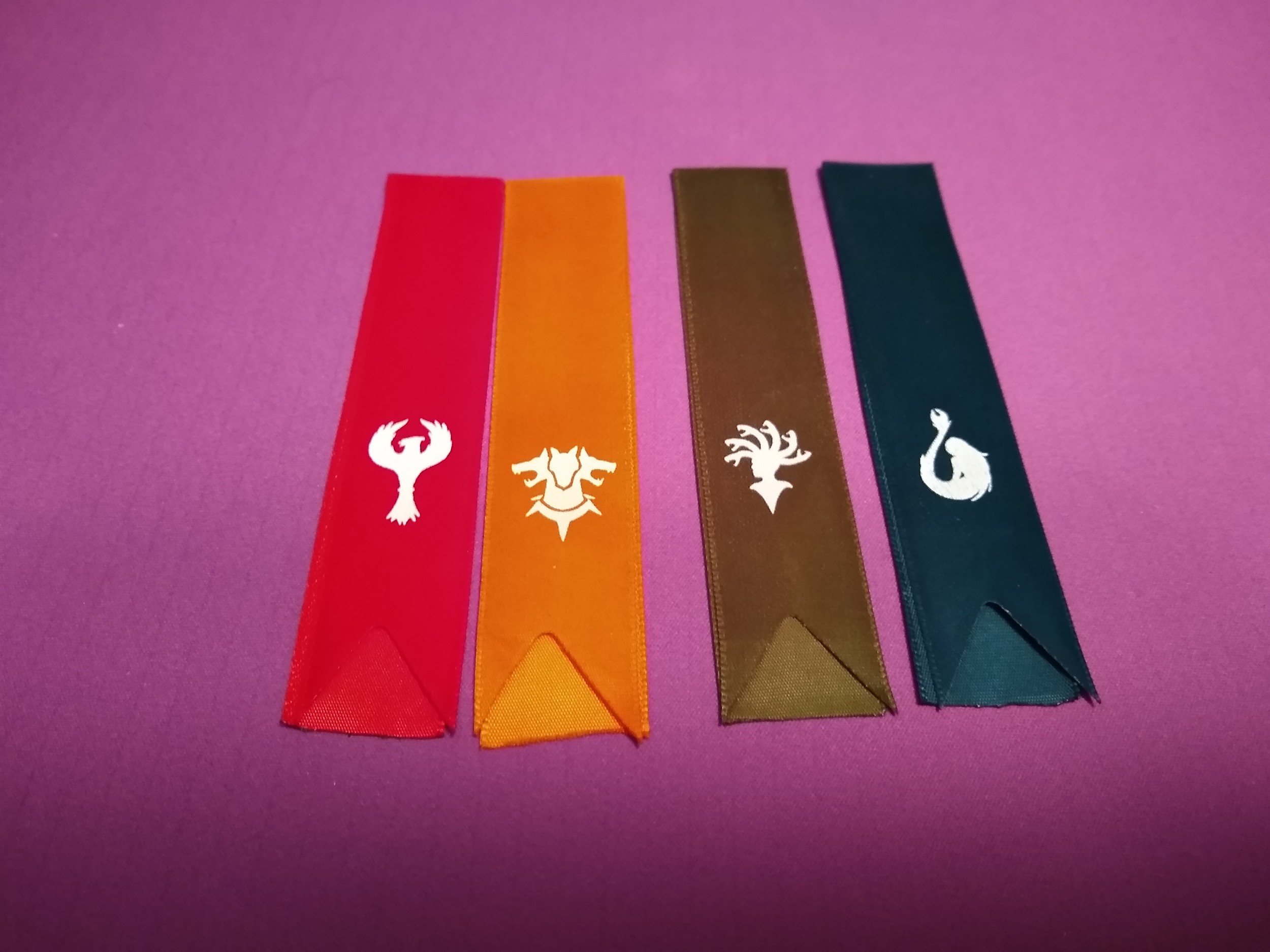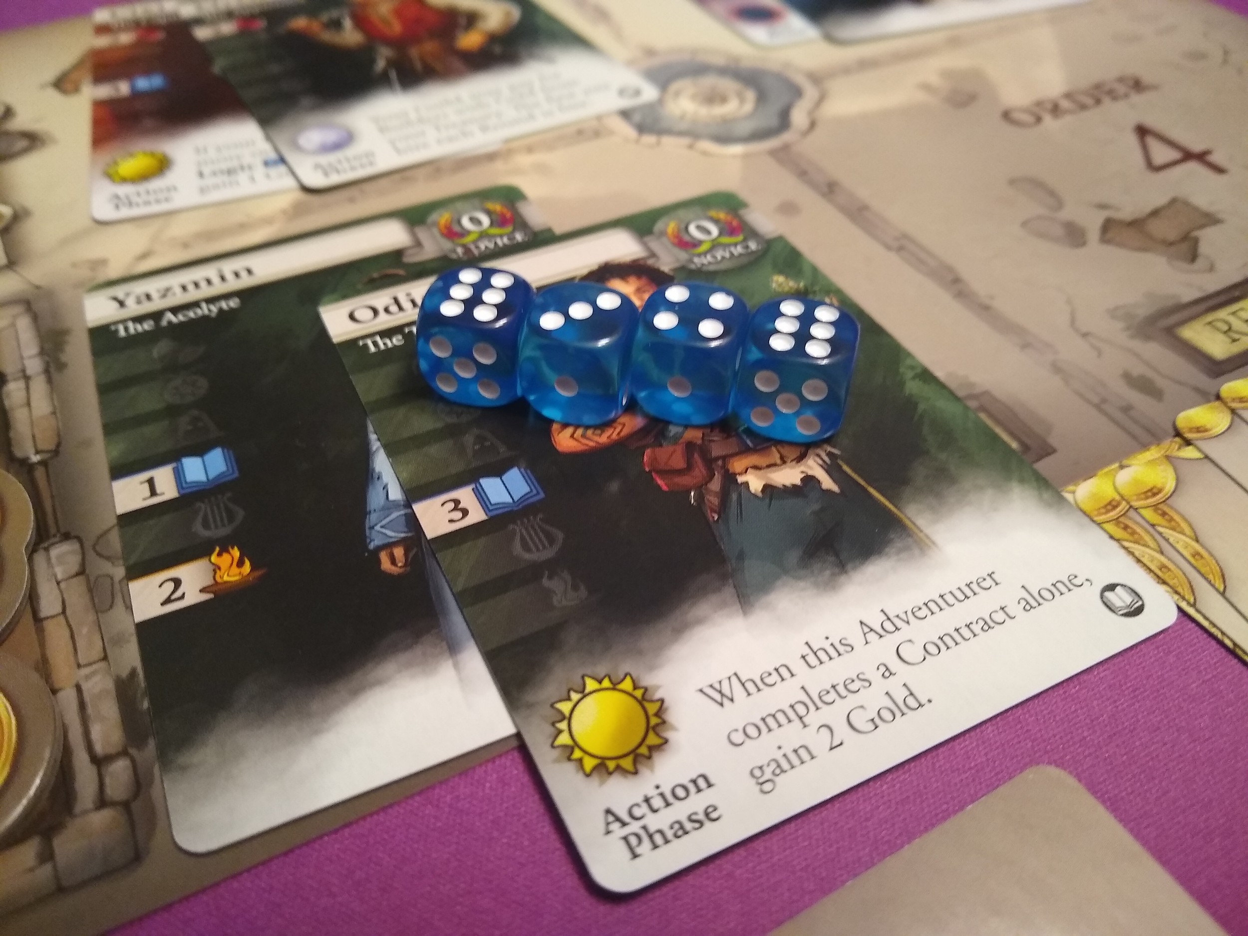 The cards and the cardboard pieces (upgrades, gold, fame trackers, etc) are all pretty average quality, no complaints. The dice are very nice, translucent dice. I don’t really know why they came in multiple colors, but that’s not a big deal, they’re great. The guild ribbons are a cute addition to make it easy to tell when players are ready, nice quality ribbons.