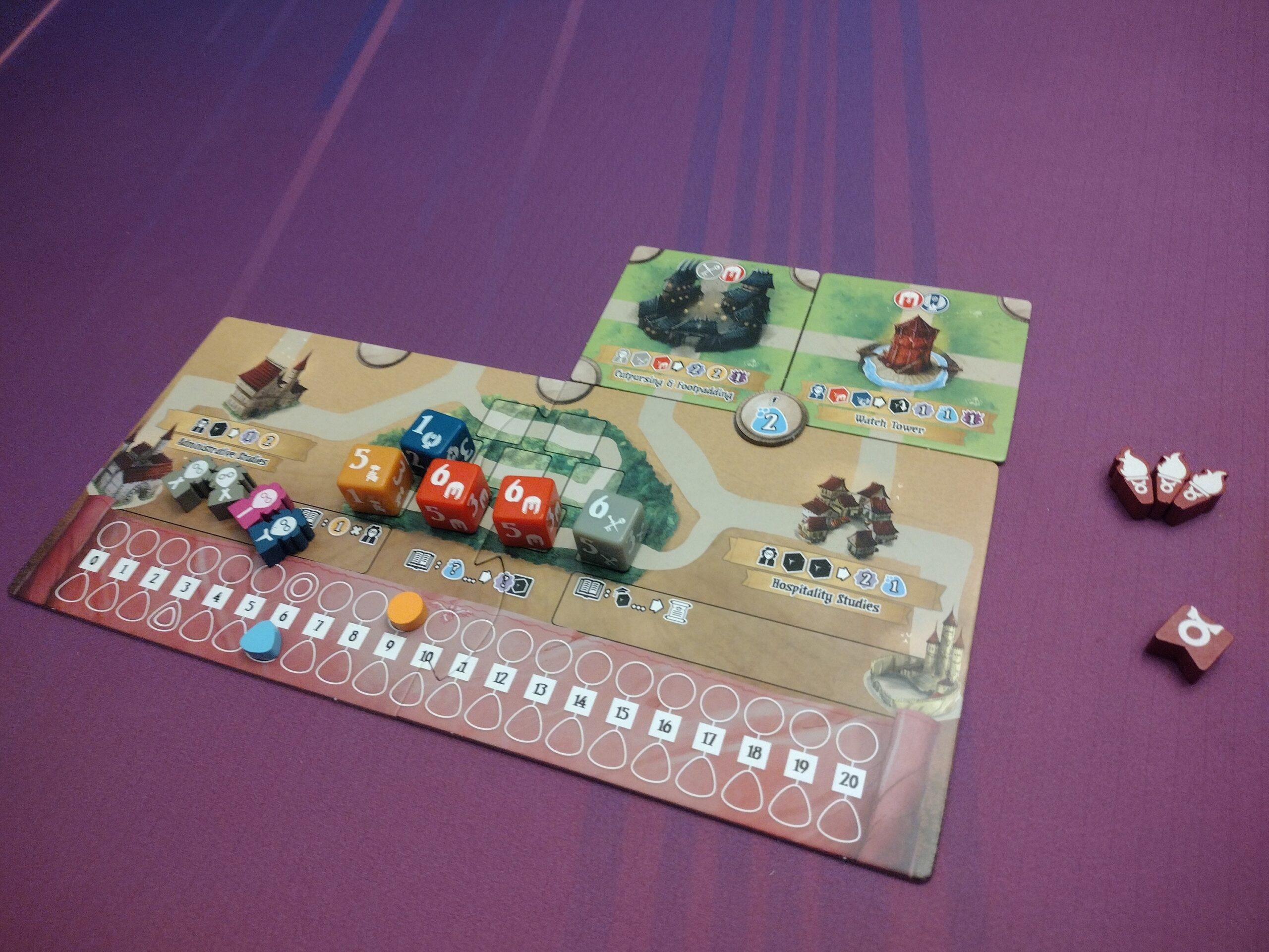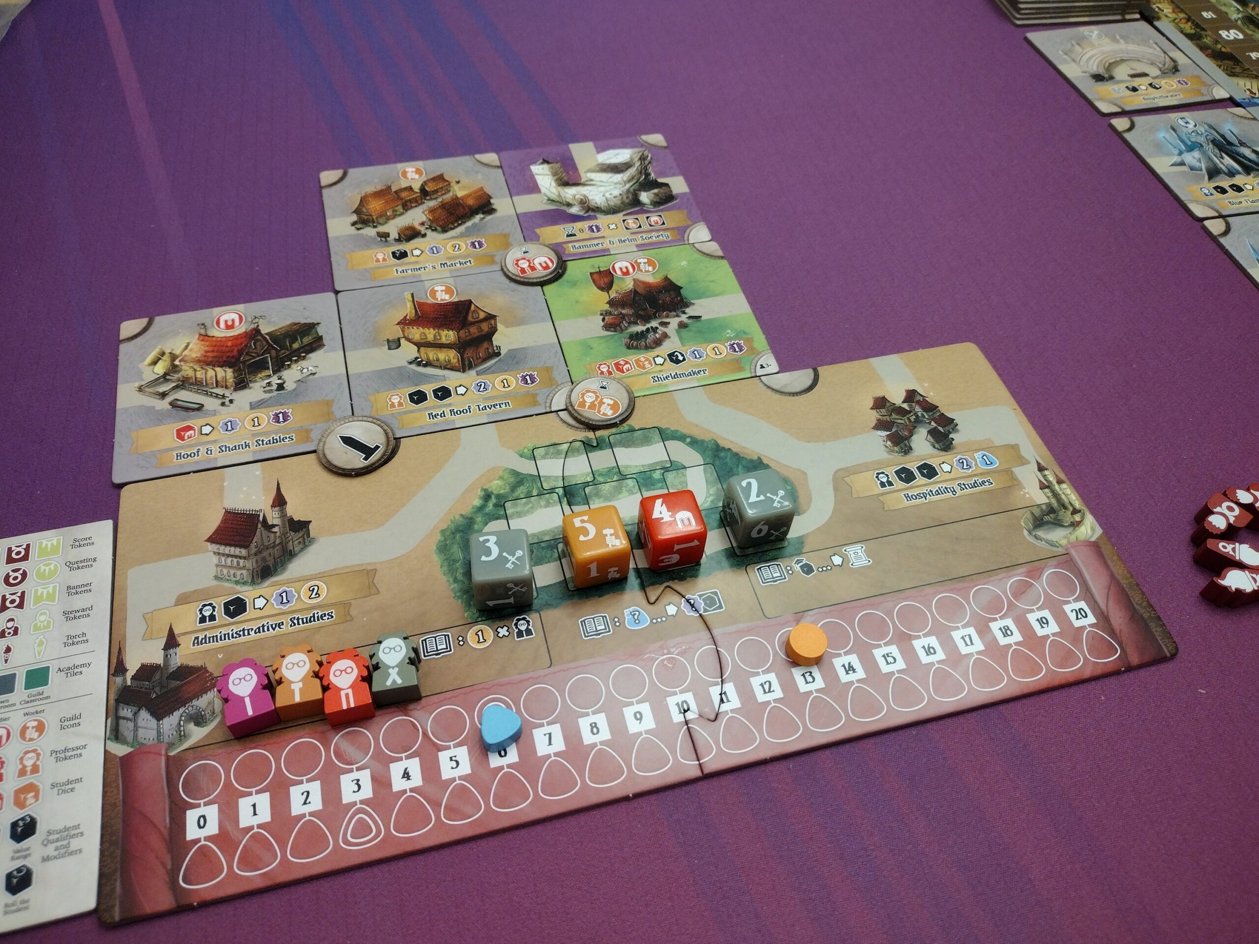 Worker Placement / Drafting /- Each round, players will place 3 workers out to draft different student dice. The die they choose will allow them to access a certain action, depending on where they select from. They might purchase tiles, move their banners (for abilities or end-game scoring), or draft professors. The cost of the action is correlated to the value of the die they take – lower value dice allow players to do actions for less gold, but it will take more knowledge to have those students learn enough to graduate.