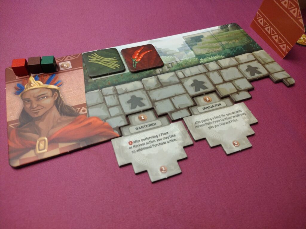 Tile Placement (Farming) – Throughout the game players will be placing seed tiles onto the terrace to score harvest points, which they’ll cash in for coins. The bigger the farmland area of seeds they play into, the more harvest points they’ll score for that placement.