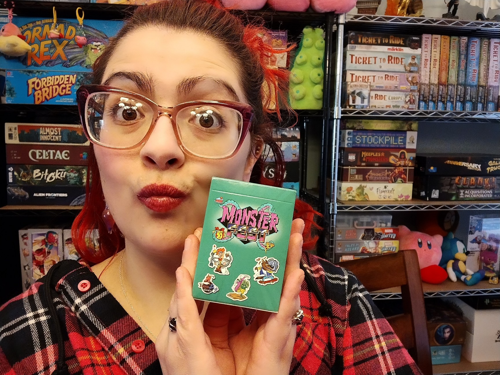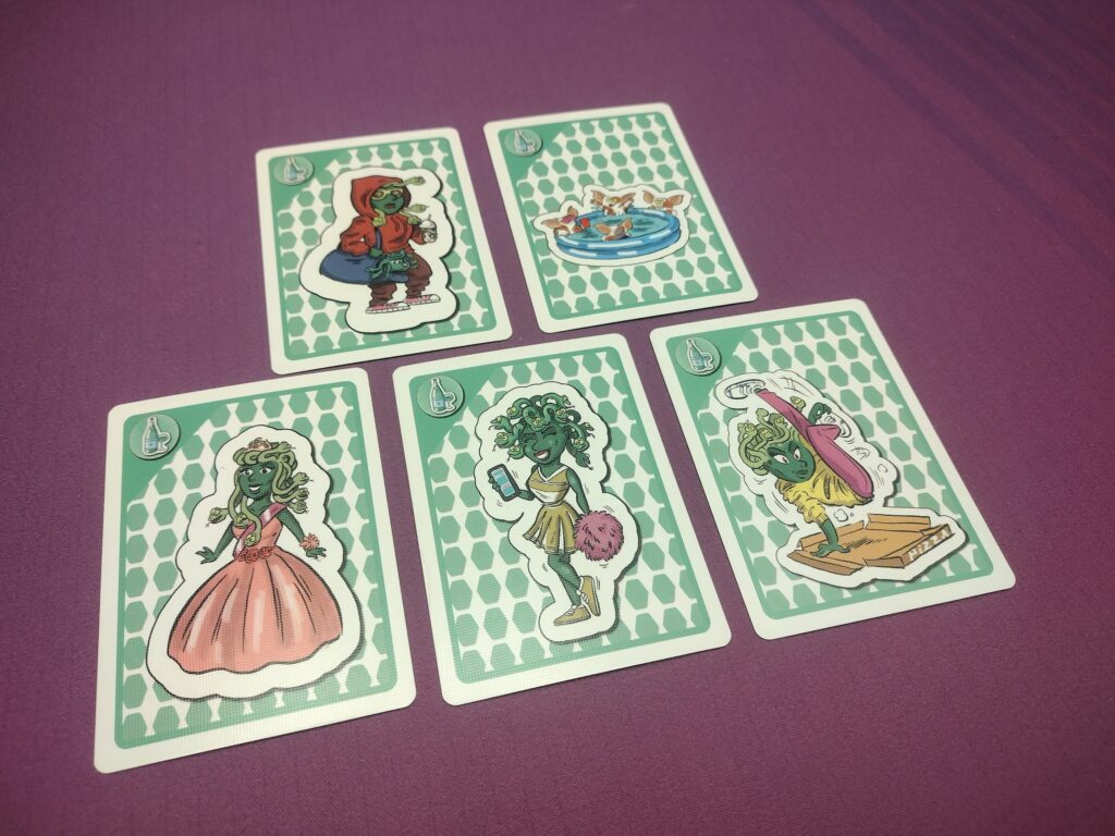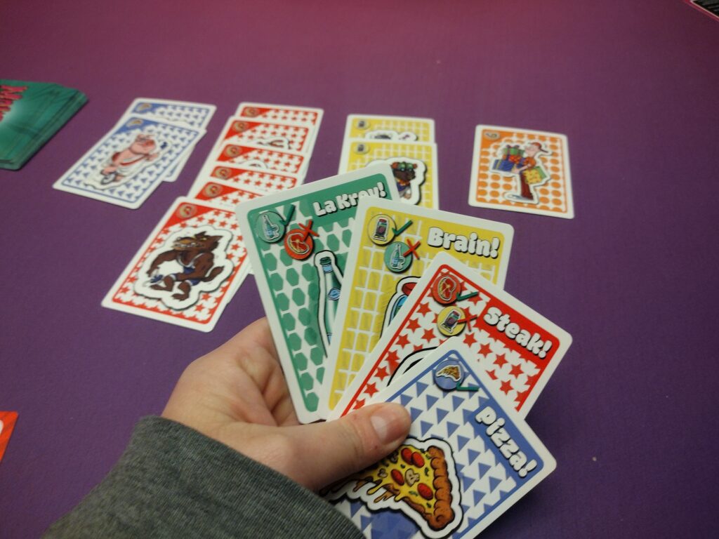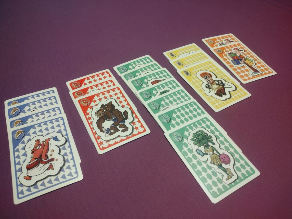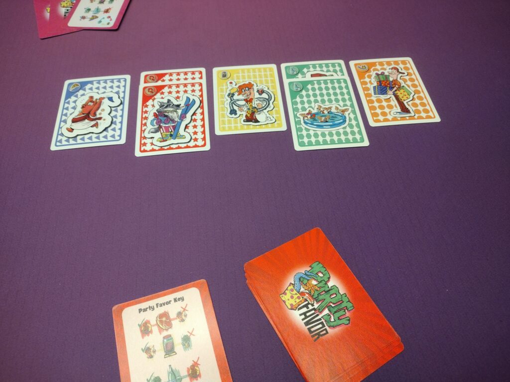 Rock-Paper-Scissors – Each round, players will simultaneously choose a party favor card from their hand, hoping to collect the associated monsters. They win if they select the party favor that X’s the most flipped cards. Players can collect extra stacks if the delivery guy is out when you win a flip, or if you are the only player to play the pizza favor when the party pig is out.