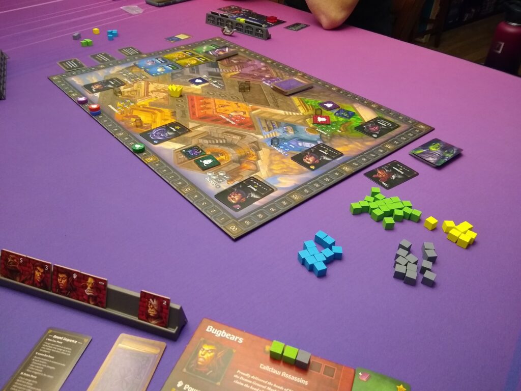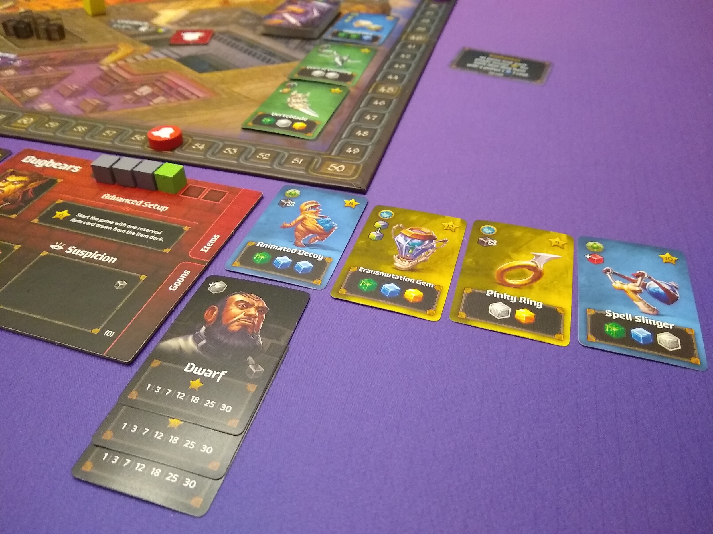 I really enjoyed this game! The mechanics are pretty basic (place a worker each turn) but the added elements of needing to control (highest total) a location to get a reward, being able to hide some workers, and not being able to revisit locations (i.e. put more works there once you already have on a previous turn) all really adds to the strategy and it can be hard to decide which path to try. I’ve seen success with going with an all-goon strategy, as well as an all-crafting strategy, and others where you do a bit of everything. I will say that after many plays, the game seems a bit long, but at the same time, I don’t really notice during the game, because it’s enjoyable. I have to pay attention on every player’s turn so I can gauge my best move for my coming turn. A really fun game all around where the theme works well with the mechanics!