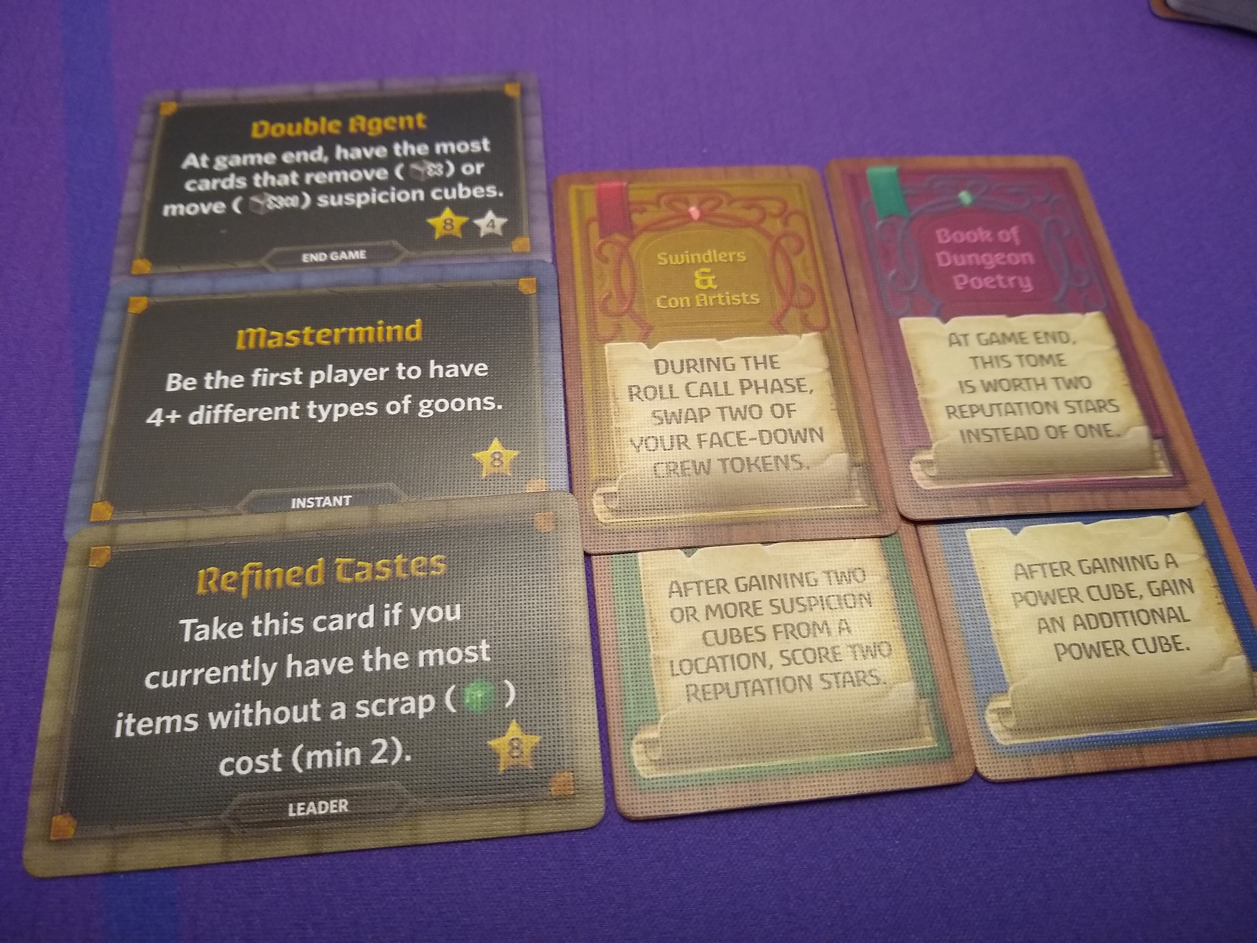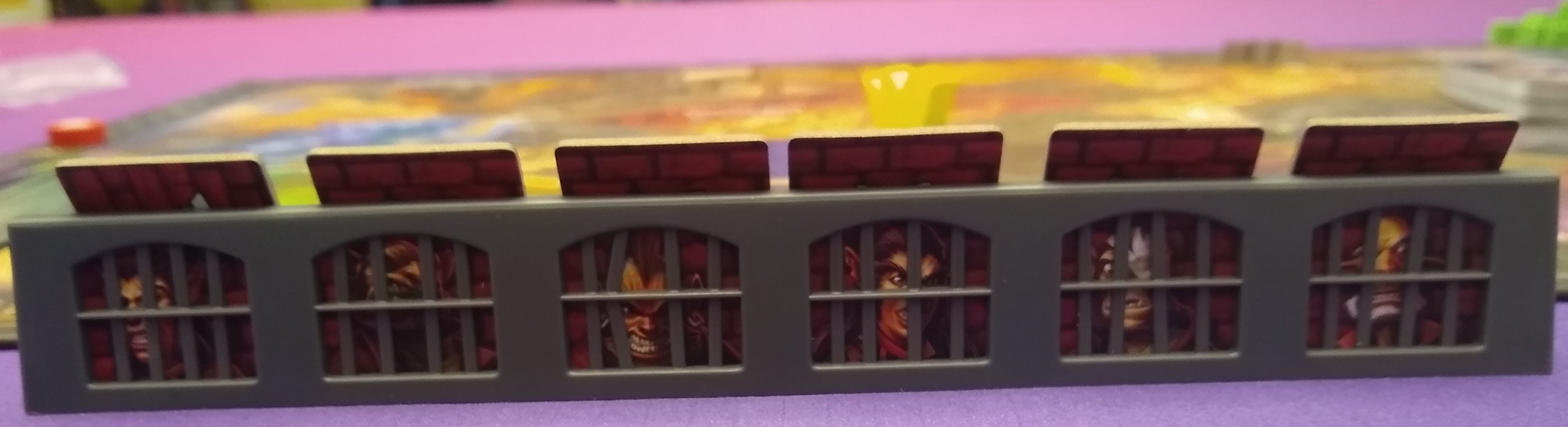 The main board is nice quality, double-sided for different player counts. The spots are distinct and all the iconography for the rewards is clear. Crew tokens are labeled by color and symbol. Average cardboard. Clear symbology. The holding cells are nice quality plastic, and a nice visual touch to the game. The crew boards are average quality cardboard. Standard vs advanced sides and distinct.