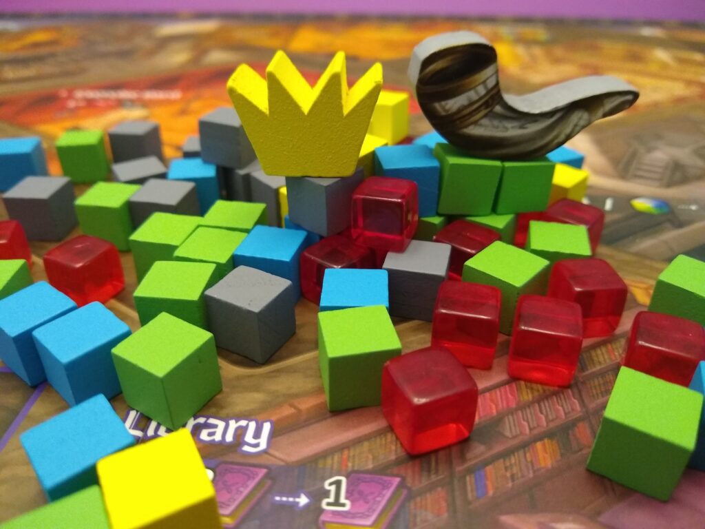 Resource cubes are standard wooden cubes in different colors. Power and suspicion cubes are nice translucent plastic cubes. The first player and round marker are nice wooden pieces with cute designs. The cards are pretty average quality. They’re mini sized, which makes sense with the spots on the board, but that’s not my preferred size, personally.