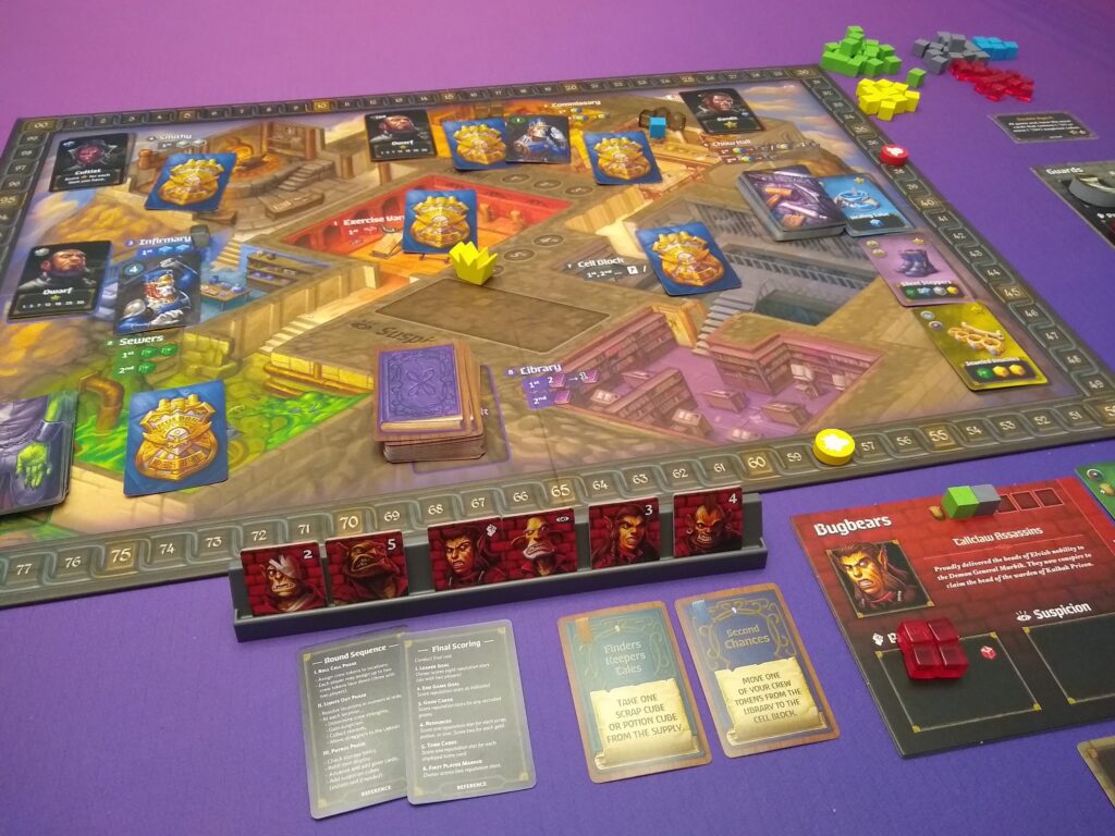 A worker placement game with area control and resource management where players are assigning crew to various locations in the prison to collect resources, gain power, recruit goons, and craft contraband. The stronger the crew, the more likely you are to reap better rewards, but the more likely you are to also gain suspicion from guards, which won’t be pretty when they raid the cells. In addition to their average crew, players each have an Enforcer, which grows stronger the more power they have, and a Lookout, which allows the player to avoid suspicion. All your nefarious activities will earn you reputation points, and after 6 rounds the player with the most reputation wins!