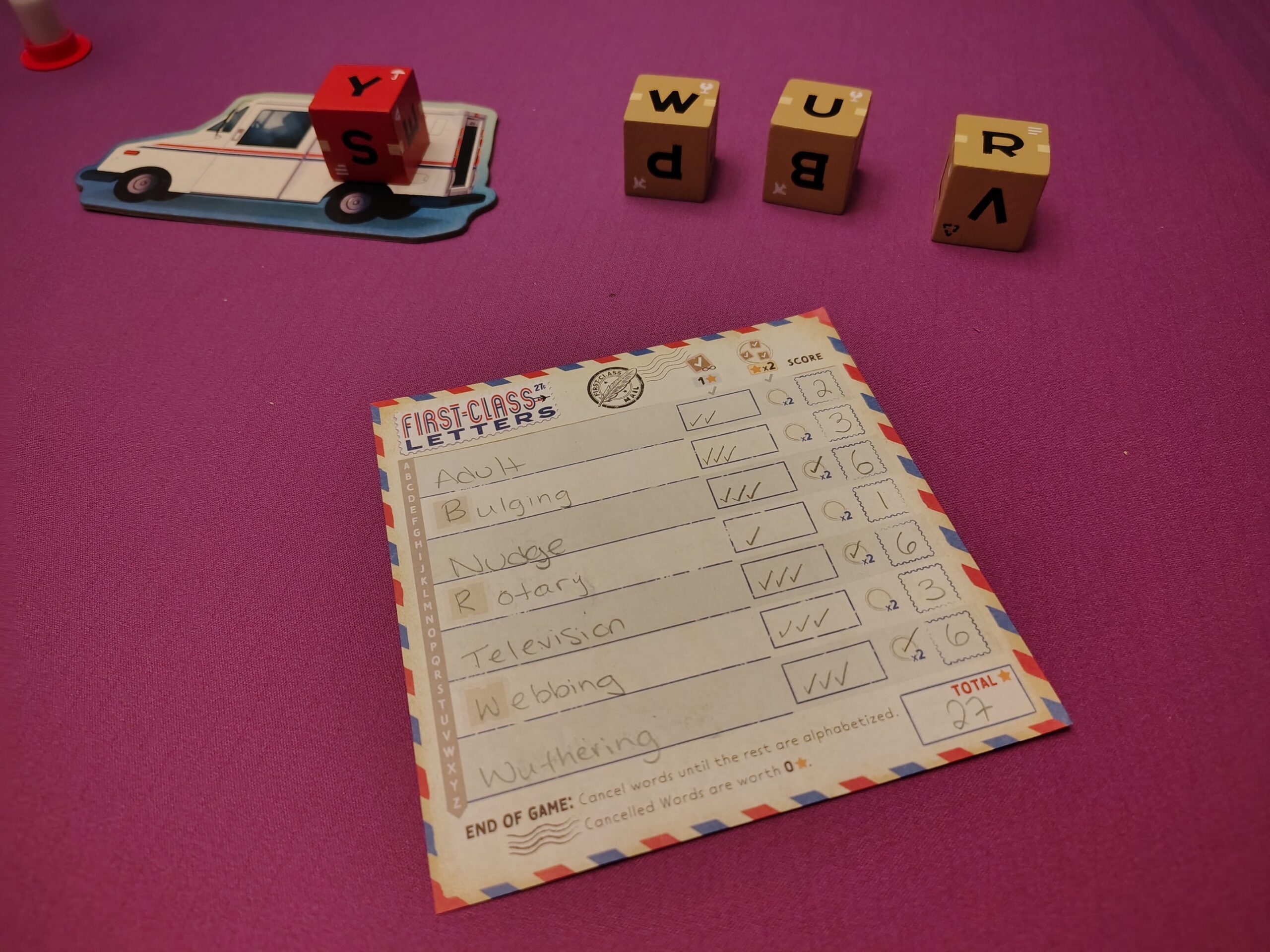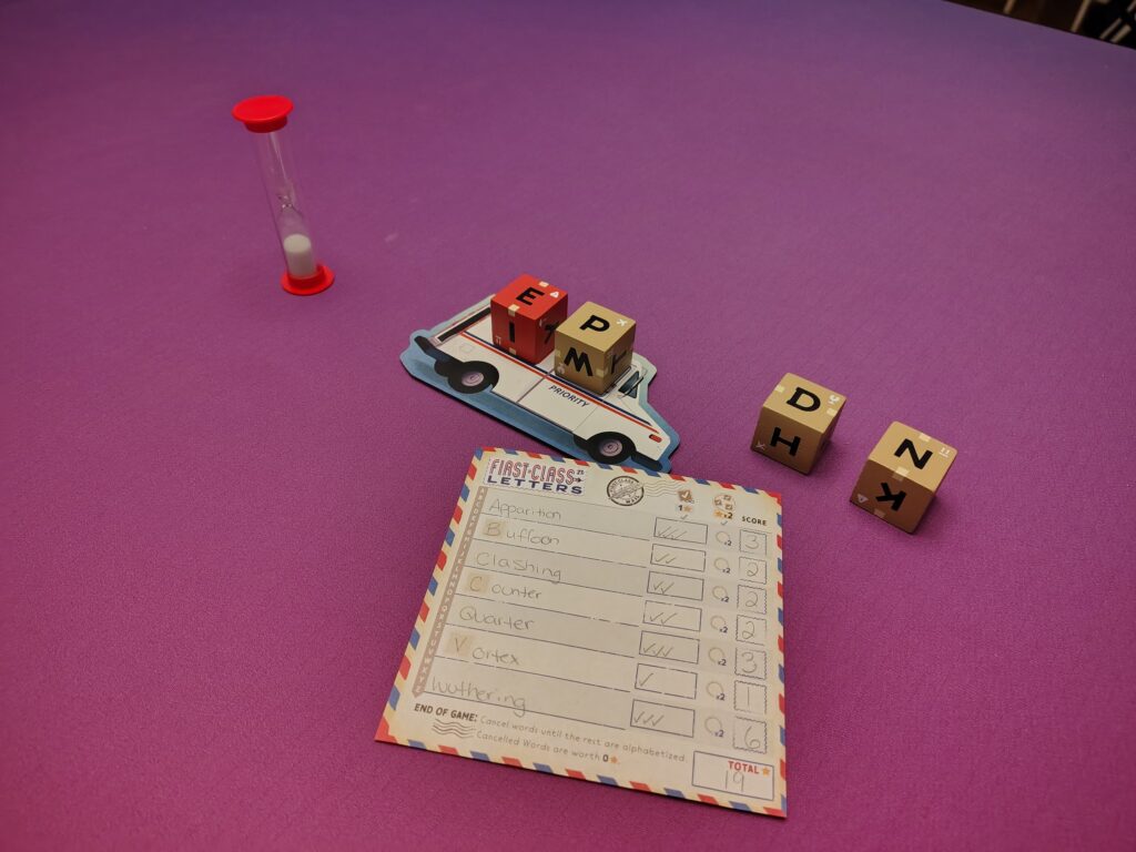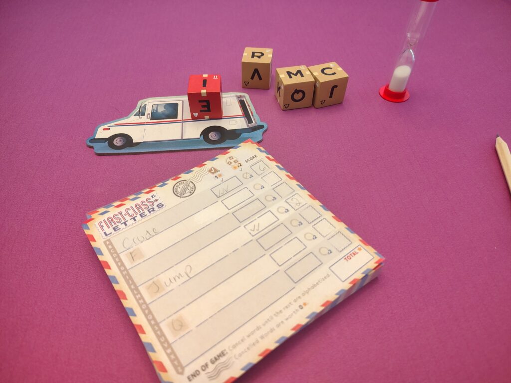 ⚙️Roll & Write / Word Game – The game starts with 3 letters in the 3 outlined boxes on the player sheet, in alphabetical order – the words on those lines, when filled out, must start with that letter. Each round, players roll all the dice. The red dead-letter die is set aside – that letter can not be used in the word that round, or players will not score for it. You get a point each time you use one of the other letters in your word, and x2 if you use all 3 letters. After 7 rounds players must make sure their words are alphabetical, or cross off words until the rest are, and add up all their word scores for their final score.