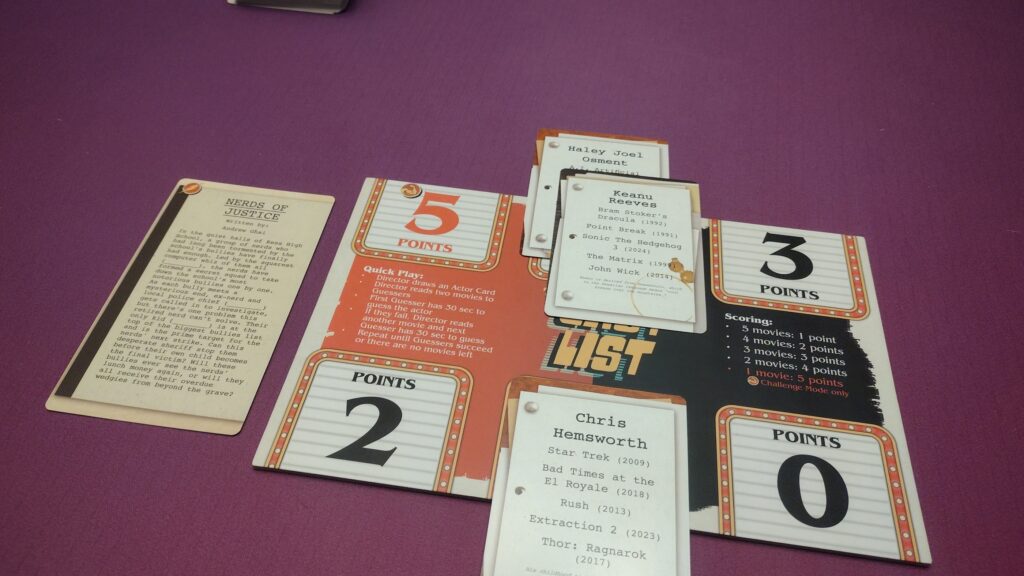 Challenge ModeClue giving team starts off by only giving 1 movie clue (worth 5 points if guessed) instead of 2. – Great for true movie buffs! Doesn’t add much time to the game, and gives players a chance at more points, so I like it.