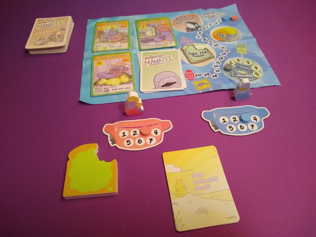 Solo: Very solid solo mode that I really enjoyed. You can play against 1-3 AI manatees. There is a small deck of cards and each AI turn, you flip a card and do the first action possible for them. It’s very smooth and simple, there’s nothing convoluted to do or remember for the player, and it still gives the player room for strategy because they still need to be aware of what the AI manatees are doing and plan the best times to take certain actions themselves, especially paying debt.