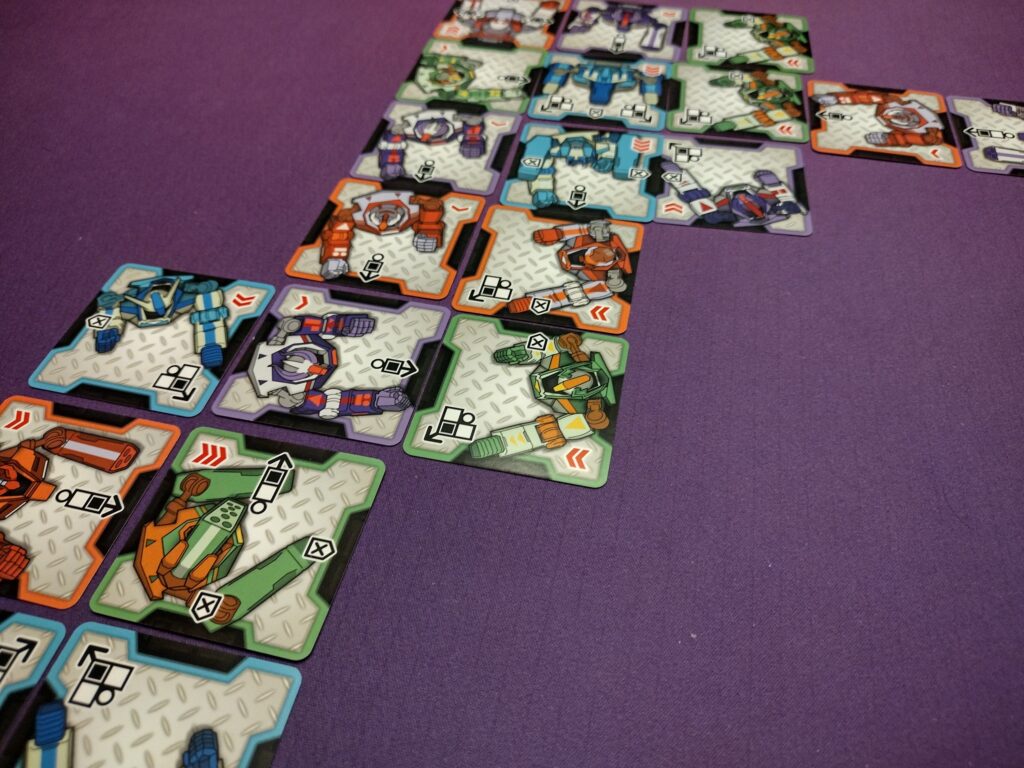 Tile Placement / Pattern Building – Each round players will play 5 robo cards into the grid during the staging phase, trying to line themselves up to attack other robos. Robo cards show which direction/space they target, which directions (if any) they have shielded, and how many hits they need to take to be defeated. Players must choose their placement wisely! Players also have the option to layer their cards after the first round to vary the board more.