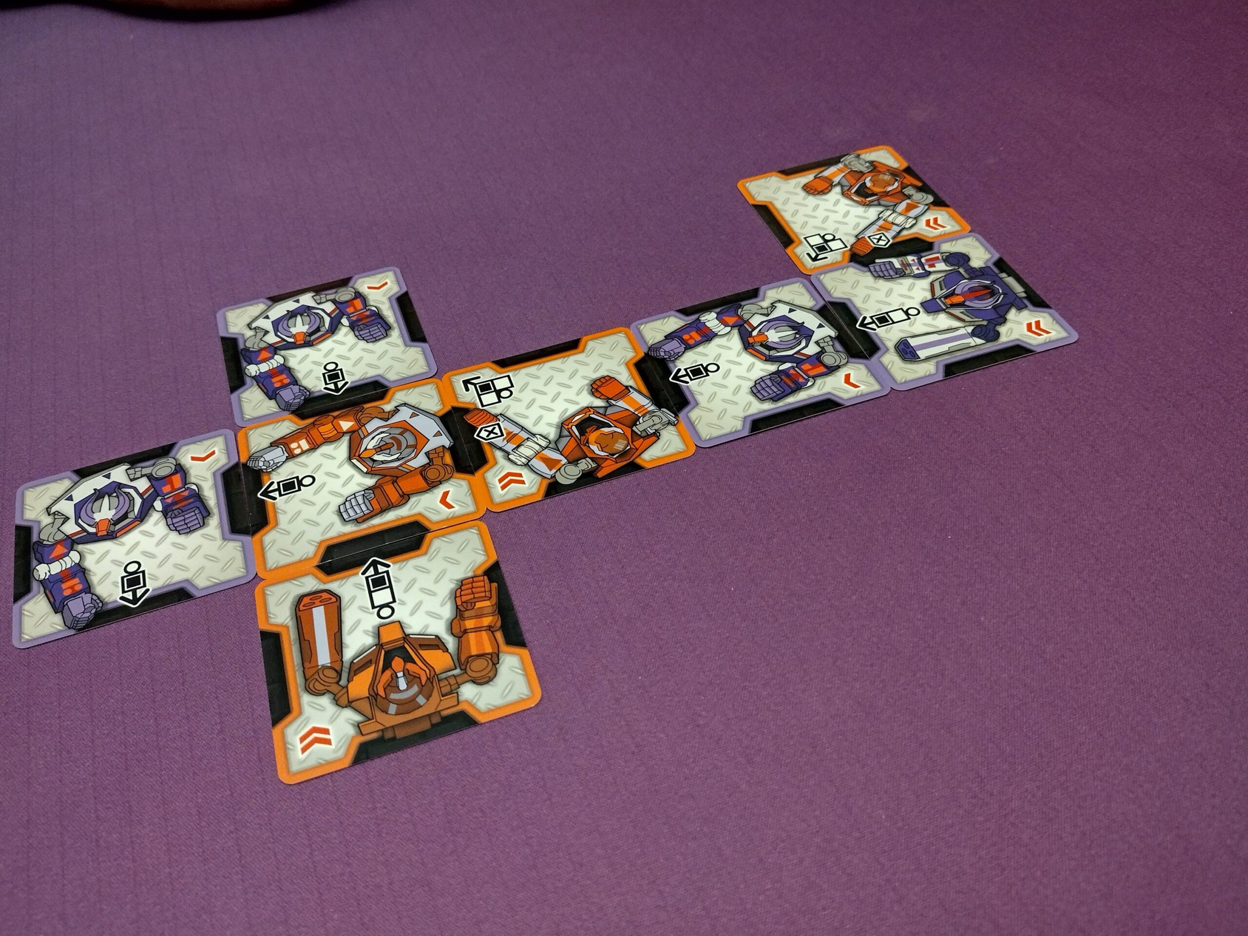 Tile Placement / Pattern Building – Each round players will play 5 robo cards into the grid during the staging phase, trying to line themselves up to attack other robos. Robo cards show which direction/space they target, which directions (if any) they have shielded, and how many hits they need to take to be defeated. Players must choose their placement wisely! Players also have the option to layer their cards after the first round to vary the board more.