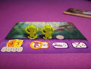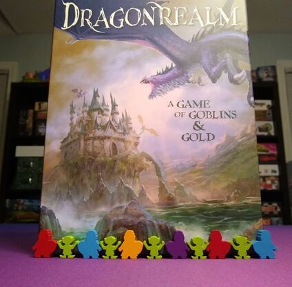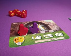 The cards are nice quality with a linen finish, and the art is really aesthetically appealing and fits well with the theme. The dice are marbled clear to read. The meeples are super unique and absolutely adorable; there are both goblins and little adventurers with shields! Finally, the rules are well written and detailed with a lot of great examples for play and many possible situations.