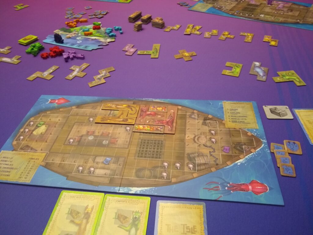 A polyomino game for 1 – 4 where players are trying to pack their boats full of cat families and treasures to rescue them before Vesh arrives to the island. Players will draft cards to help them rescue cats (by spending fish), find treasures, and study lessons (goals that may help earn them points later). Players want to make sure they always have enough fish and baskets for their rescues each round and, as they pack their boat, they want to keep like-colored cats together for larger scoring combos, and fill up rooms and cover up rats to avoid losing points. After 5 rounds players calculate scores, and the player with the most points wins!