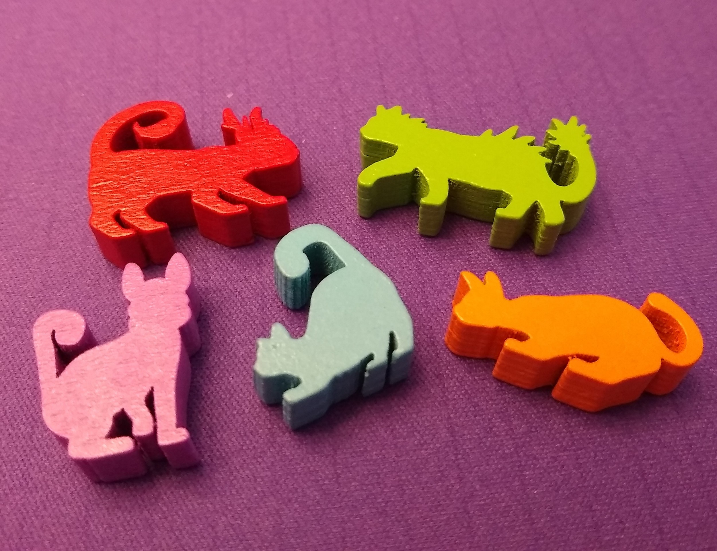 Cats / Treasures / Fish / Baskets – These are all nice, sturdy cardboard pieces. The cat & treasure pieces, which all go on the boat boards, fit nicely and don’t get stuck together. The cat pieces also have different tail styles to assist if you can’t tell the colors apart, which I love!